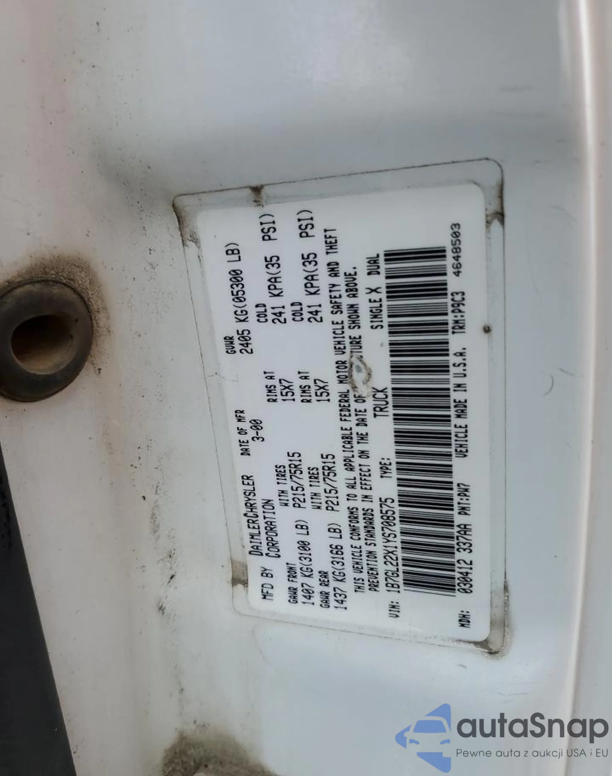 VIN: 1B7GL22X1YS708575