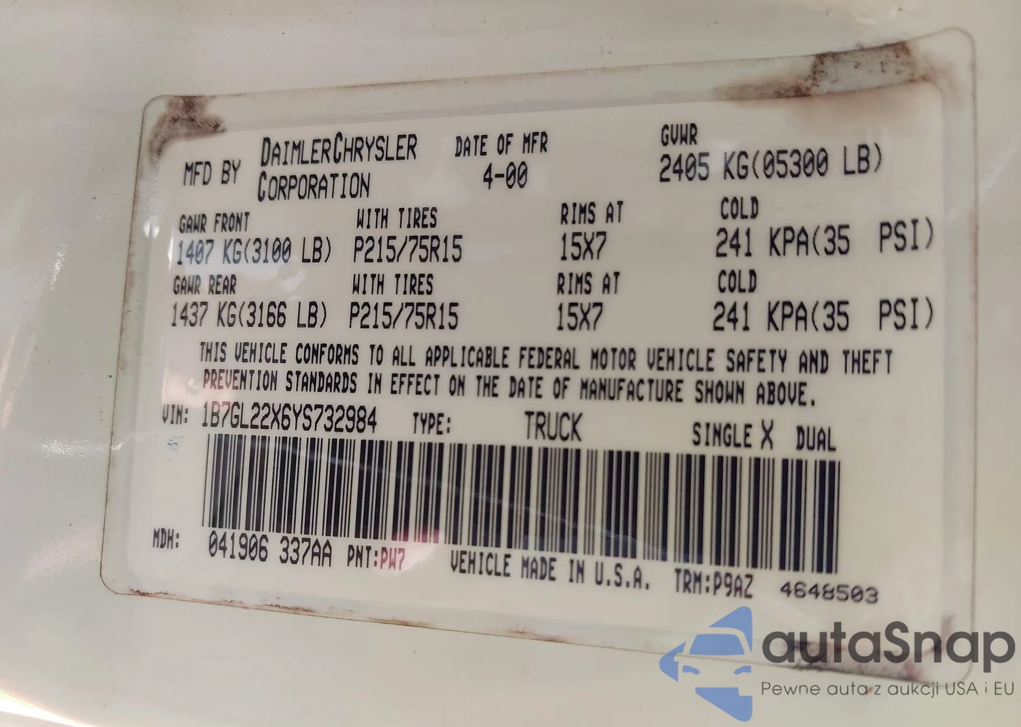 Dodge Dakota 2000 – Vehicle History (Sold at IAAI)