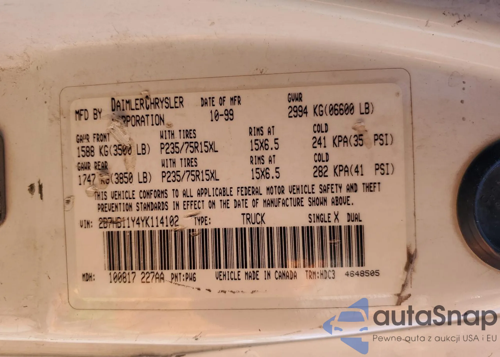 The car Dodge RAM Van 2000 (VIN 2B7HB11Y4YK114102) is sold by an unverified seller. We recommend checking the Carfax report and confirming registration possibilities before purchase.