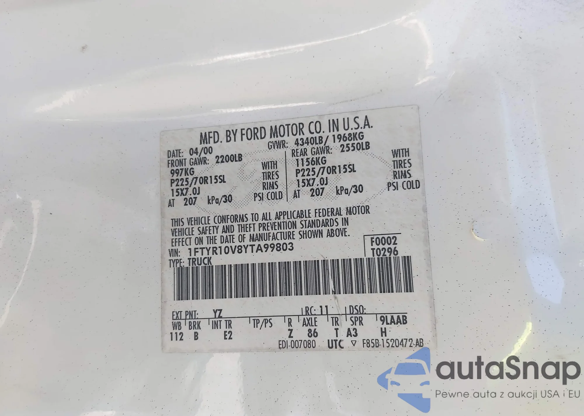 VIN: 1FTYR10V8YTA99803