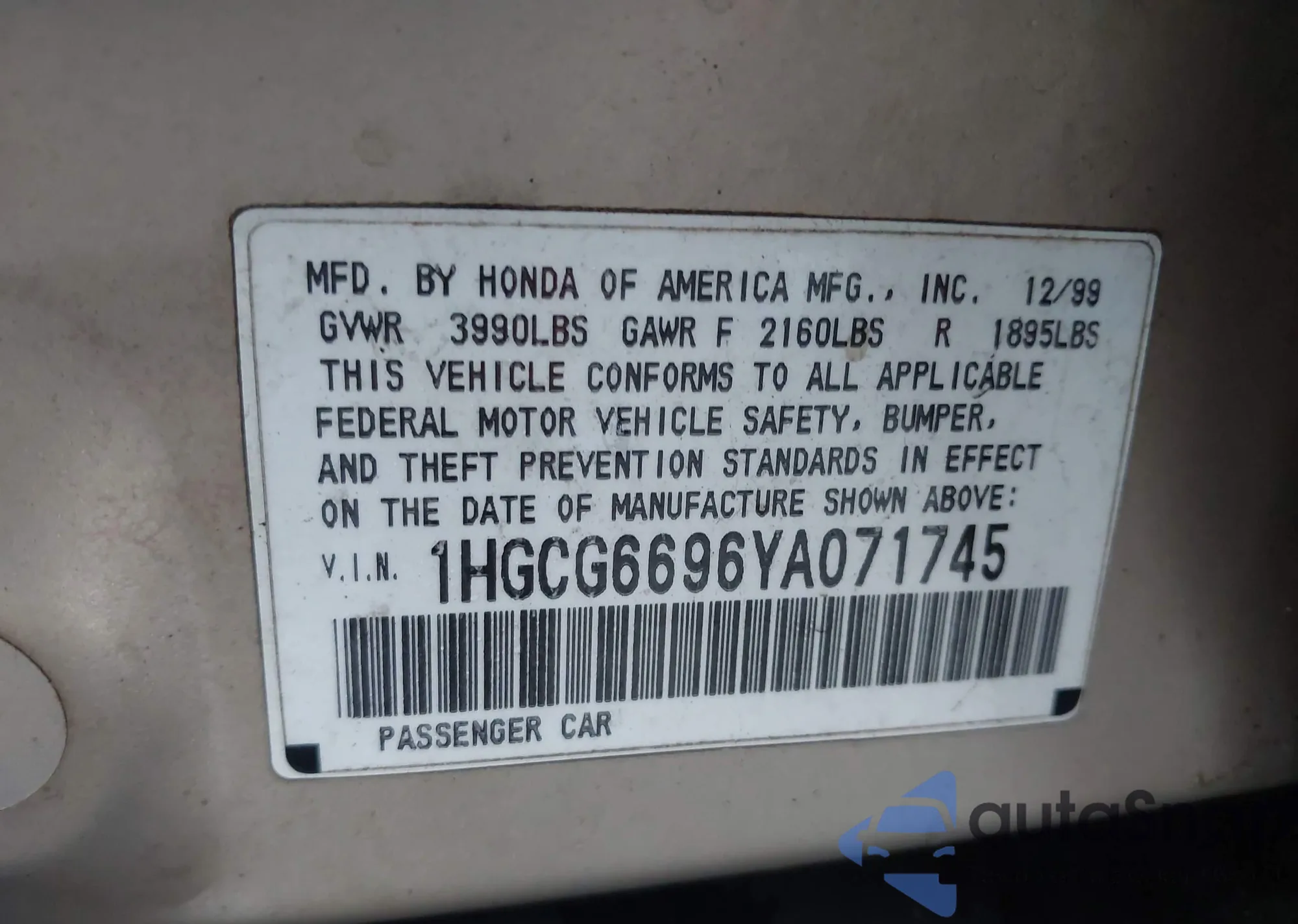 The car Honda Accord 2000 (VIN 1HGCG6696YA071745) has not been auctioned before. The documents are clean, and the mileage matches or is below the market average. Sold by an insurance company – we recommend purchase. Delivery to the port will take approx. 6–8 weeks.