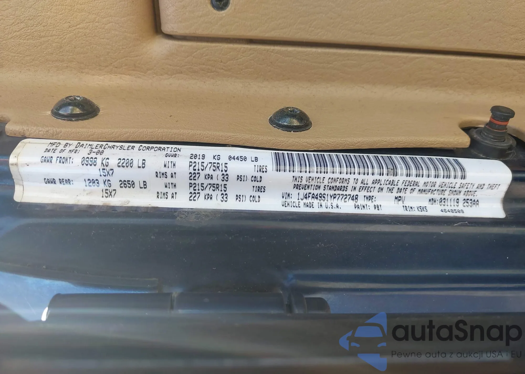 • VIN: 1J4FA49S1YP772748