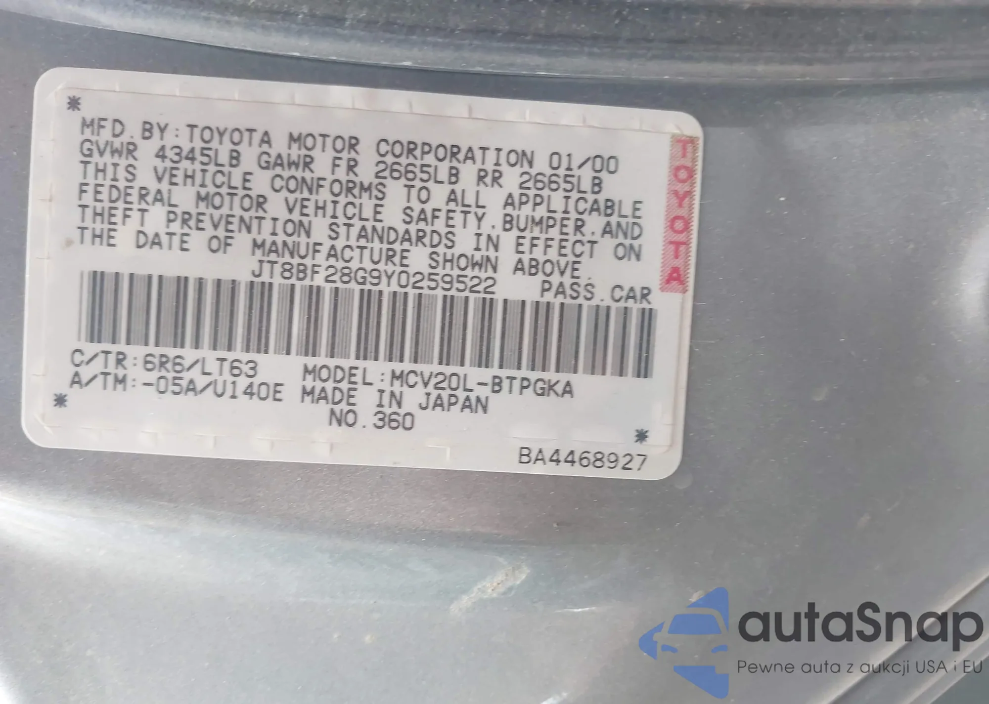 • VIN: JT8BF28G9Y0259522