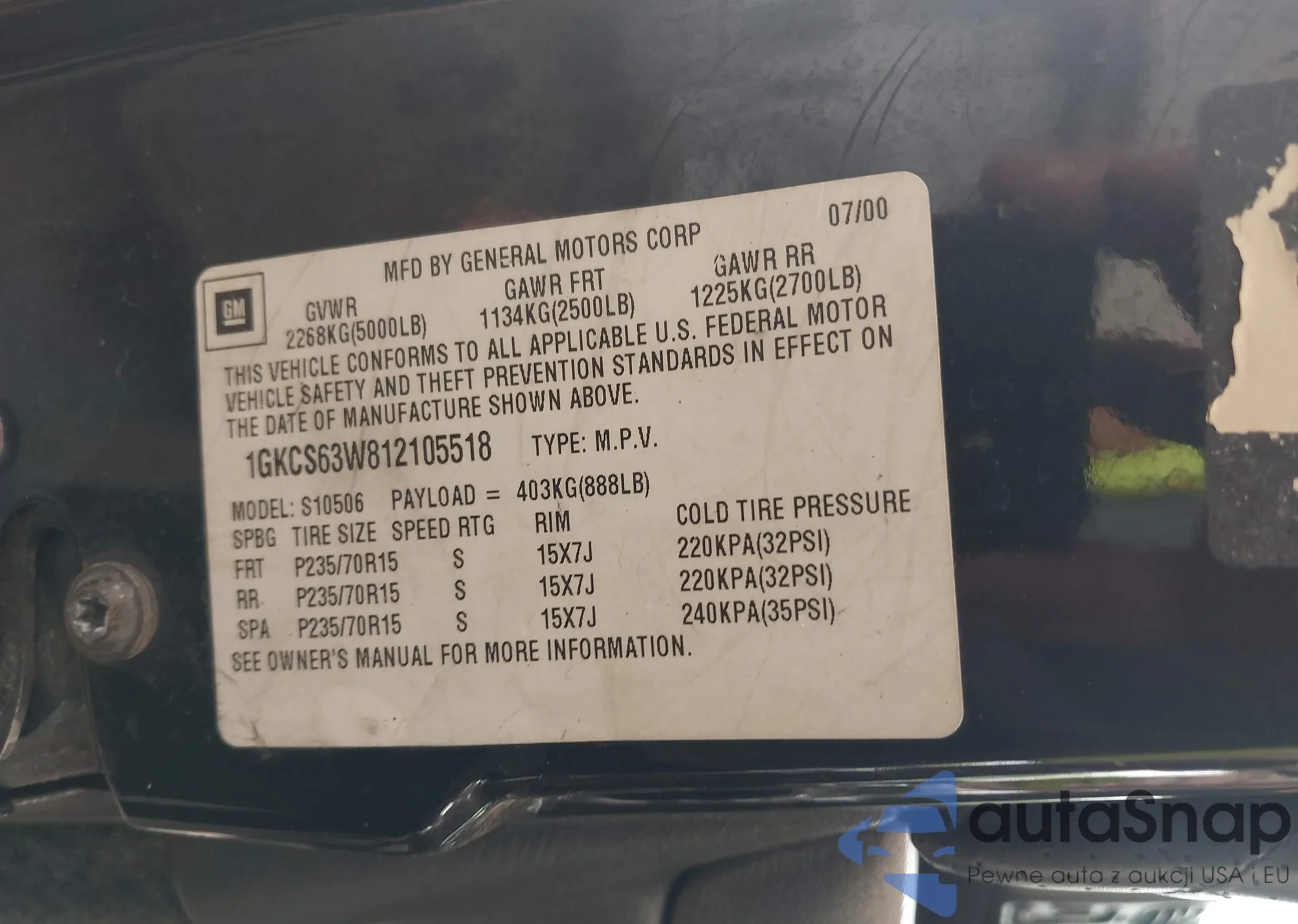 VIN: 1GKCS63W812105518