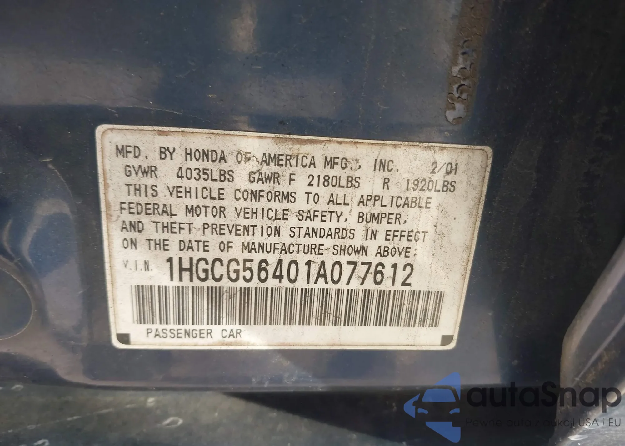VIN: 1HGCG56401A077612
