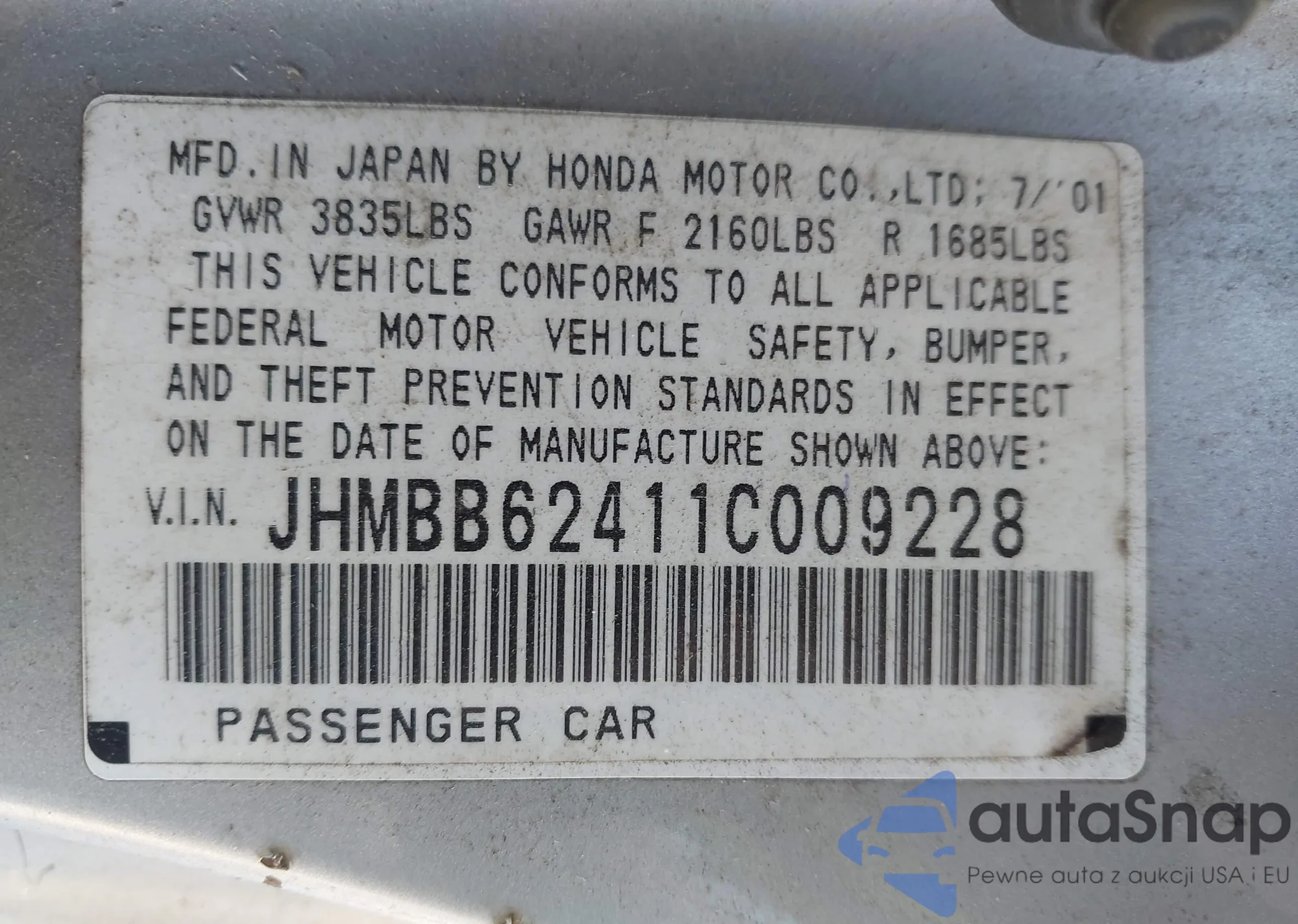 The car Honda Prelude 2001 (VIN JHMBB62411C009228) is sold by an unverified seller. We recommend checking the Carfax report and confirming registration possibilities before purchase.