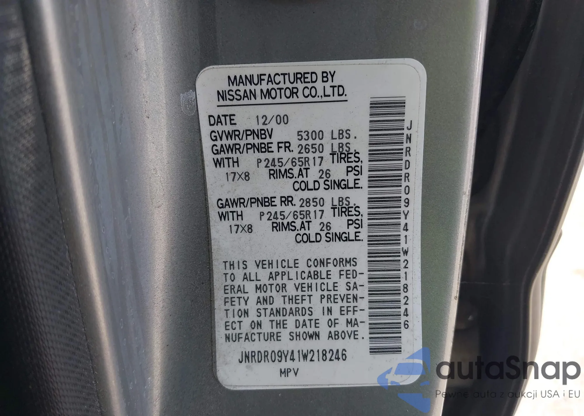 The car Infiniti QX4 2001 (VIN JNRDR09Y41W218246) has documents that prevent registration. Export and registration may be difficult. Contact AutaSnap experts to find alternatives.