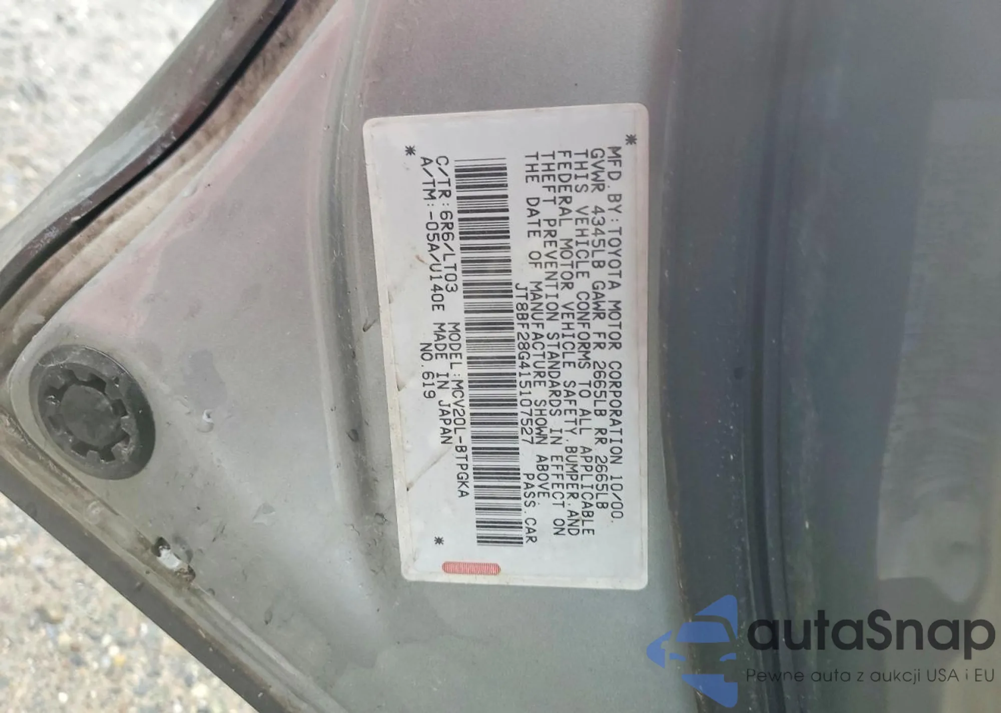 The car Lexus ES 2001 (VIN JT8BF28G415107527) has not been auctioned before. The documents are clean, and the mileage matches or is below the market average. Sold by an insurance company – we recommend purchase. Delivery to the port will take approx. 6–8 weeks.