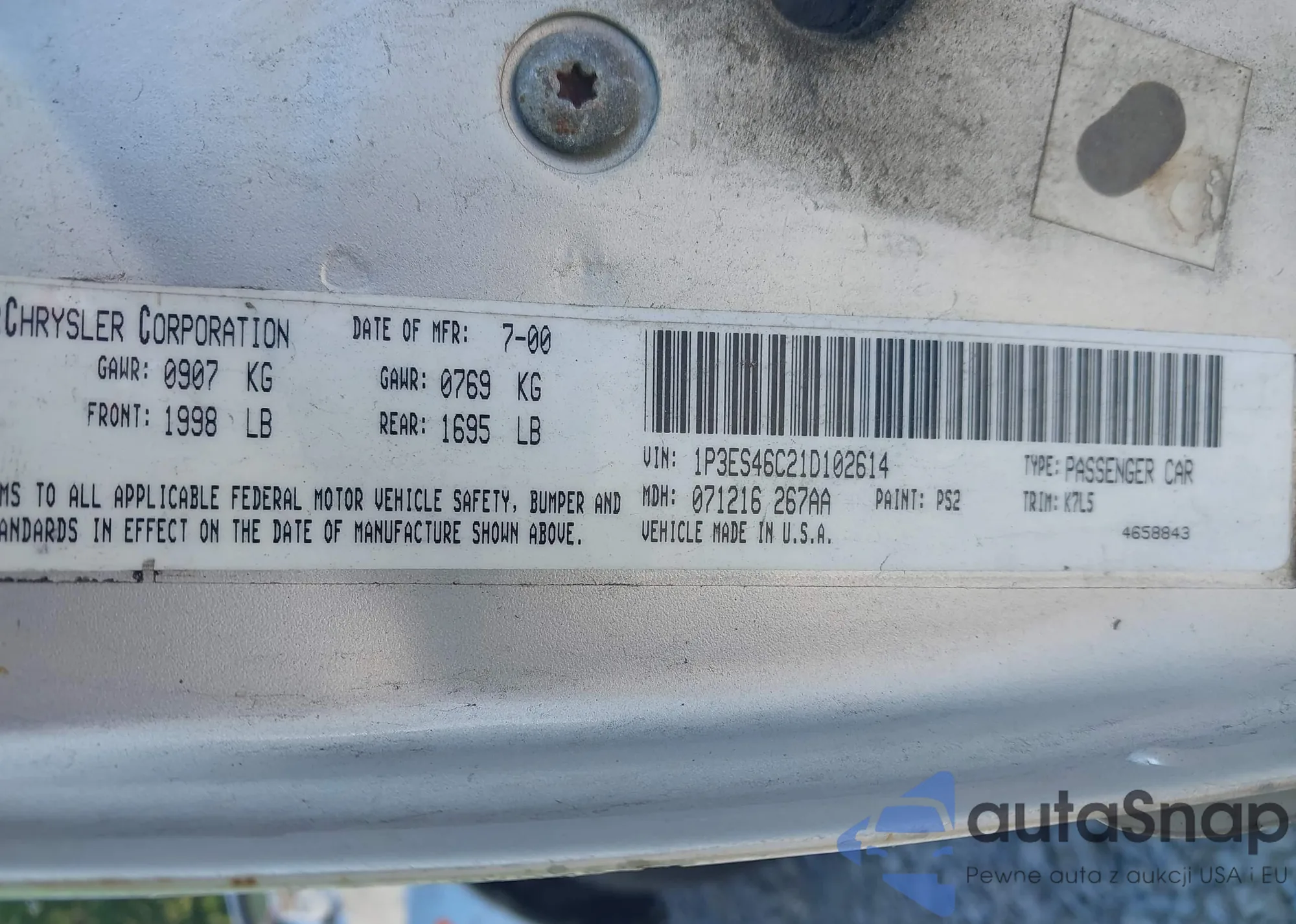 • VIN: 1P3ES46C21D102614