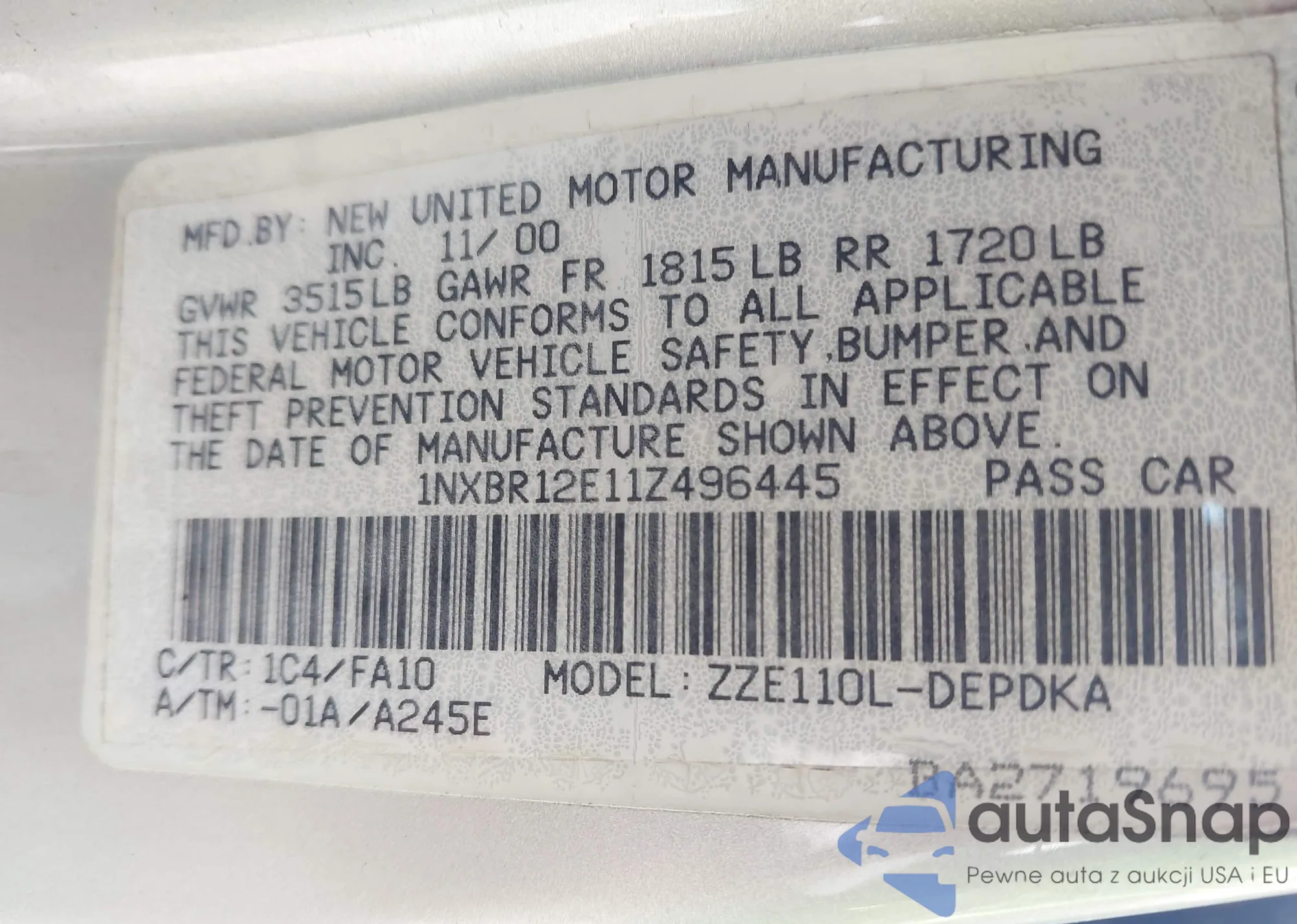 VIN: 1NXBR12E11Z496445