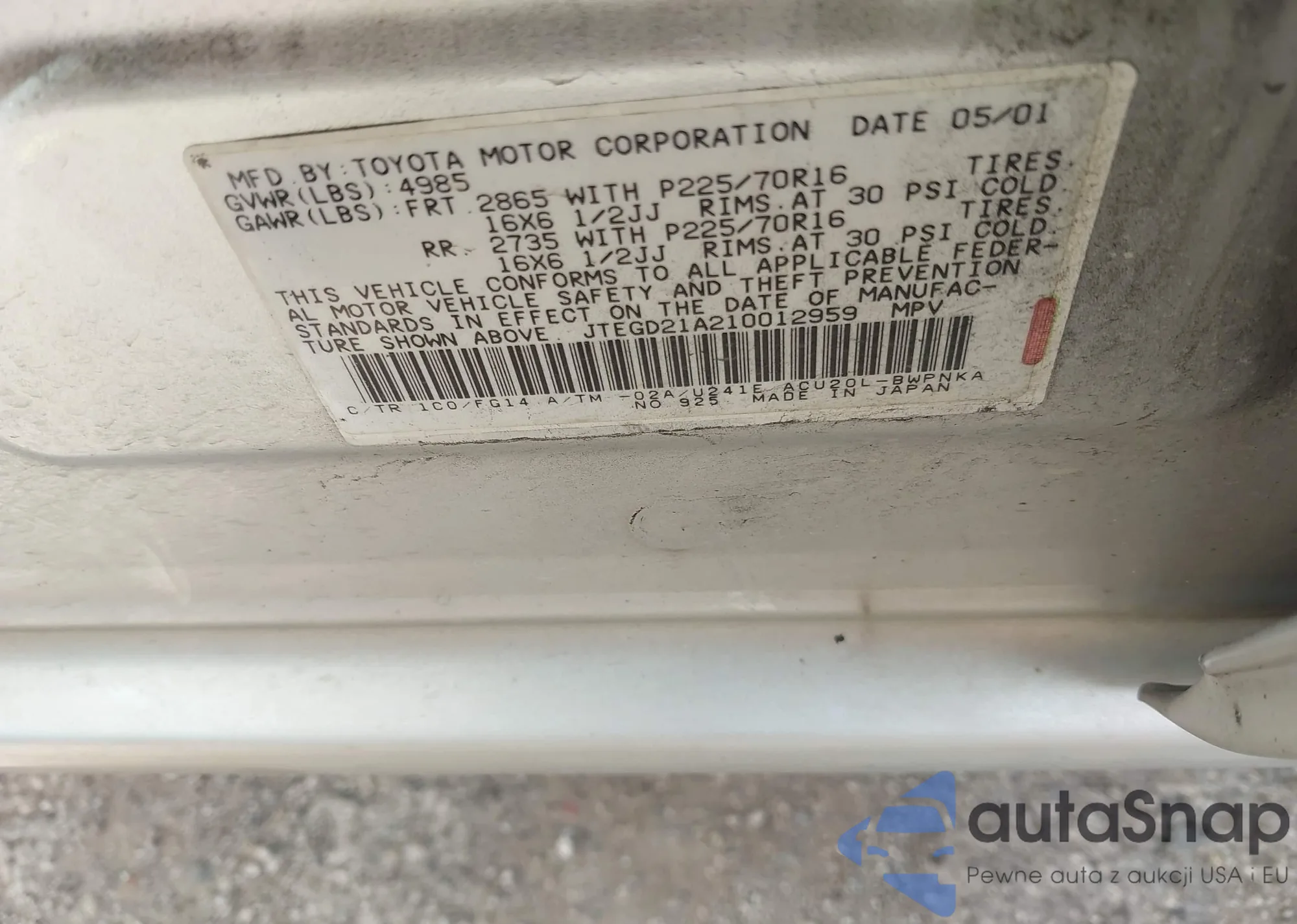• VIN: JTEGD21A210012959