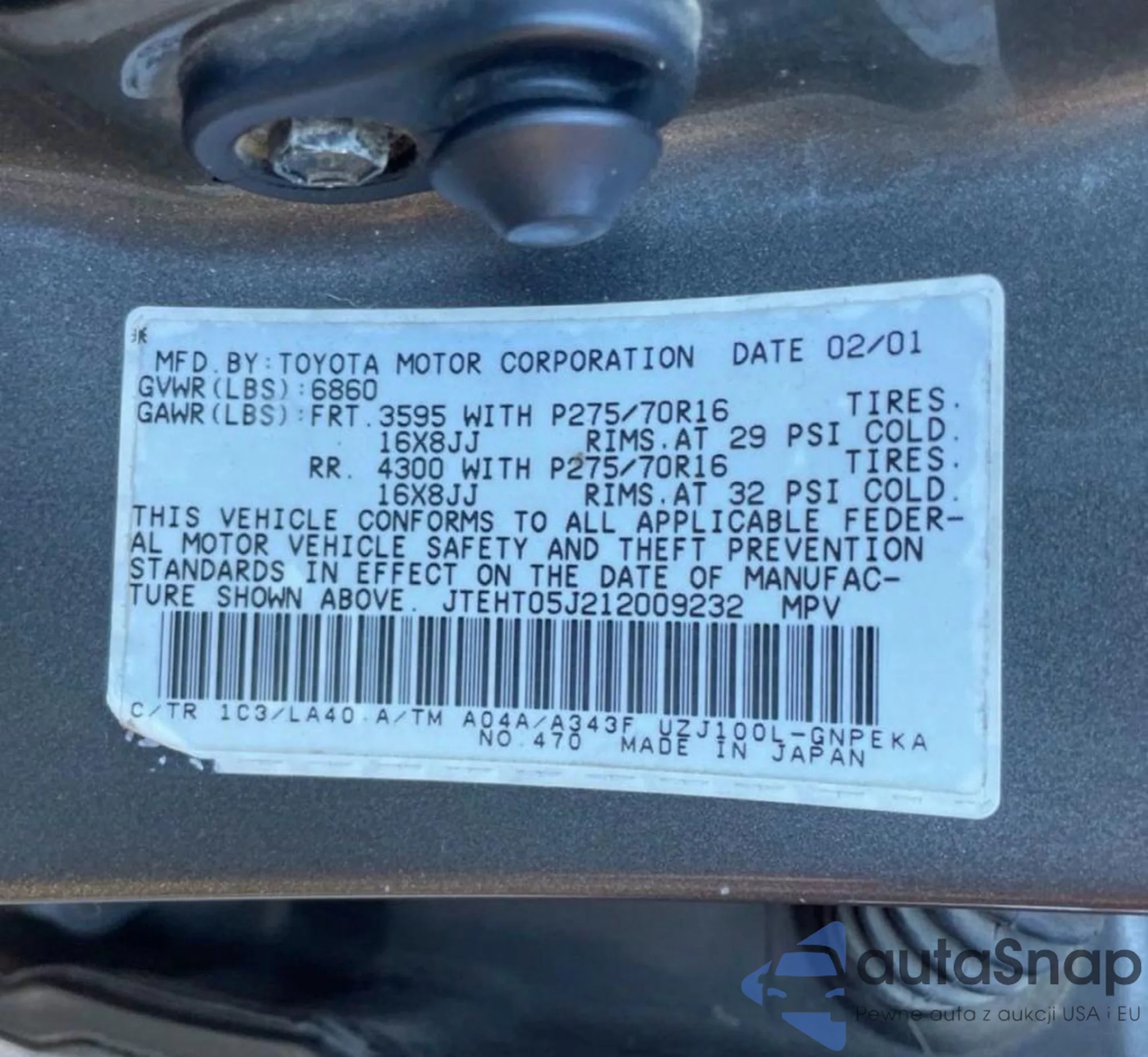 The car Toyota Land Cruiser 2001 (VIN JTEHT05J212009232) is sold by an unverified seller. We recommend checking the Carfax report and confirming registration possibilities before purchase.