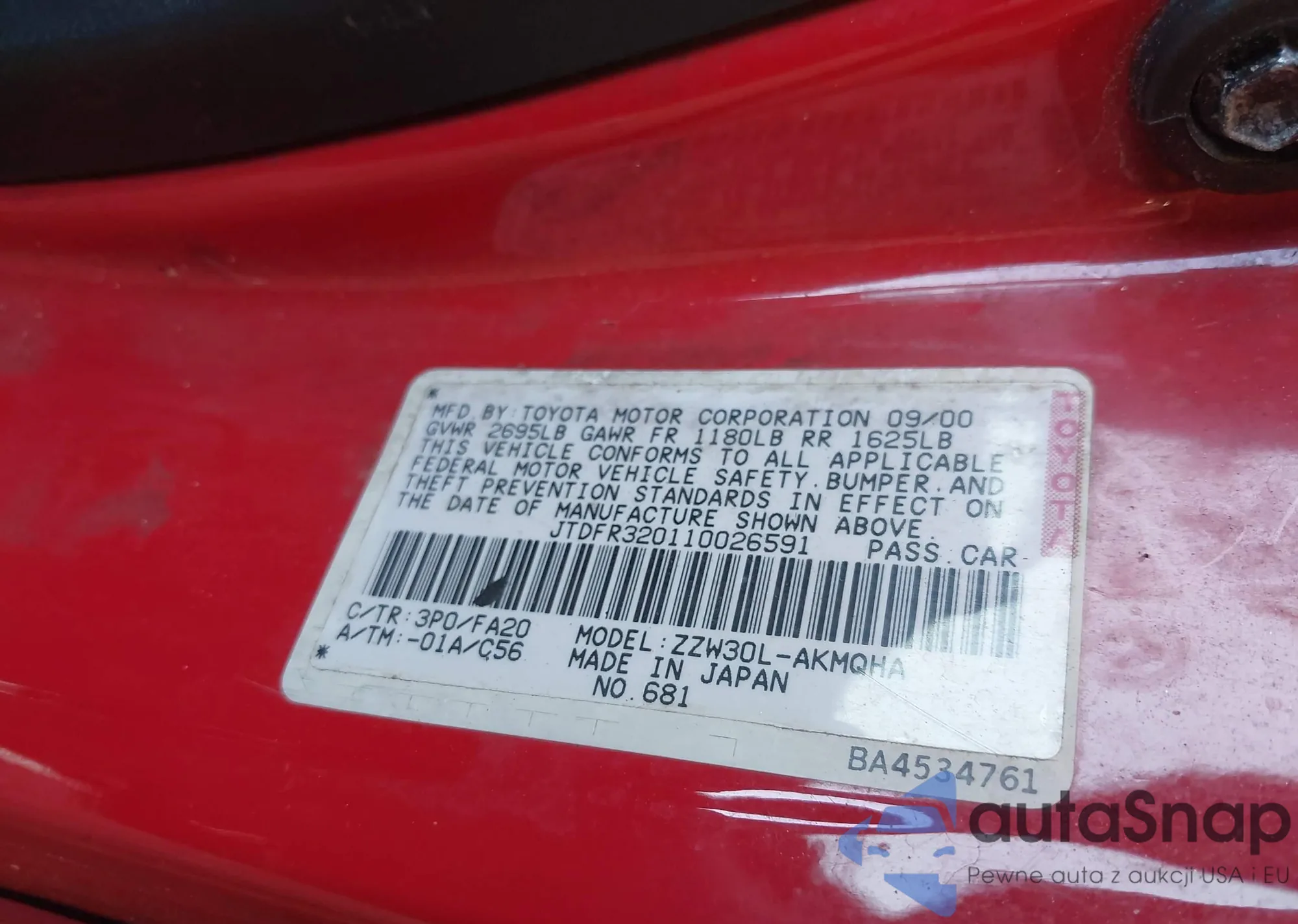 The car Toyota MR2 2001 (VIN JTDFR320110026591) has not been auctioned before. The documents are clean, and the mileage matches or is below the market average. Sold by an insurance company – we recommend purchase. Delivery to the port will take approx. 6–8 weeks.