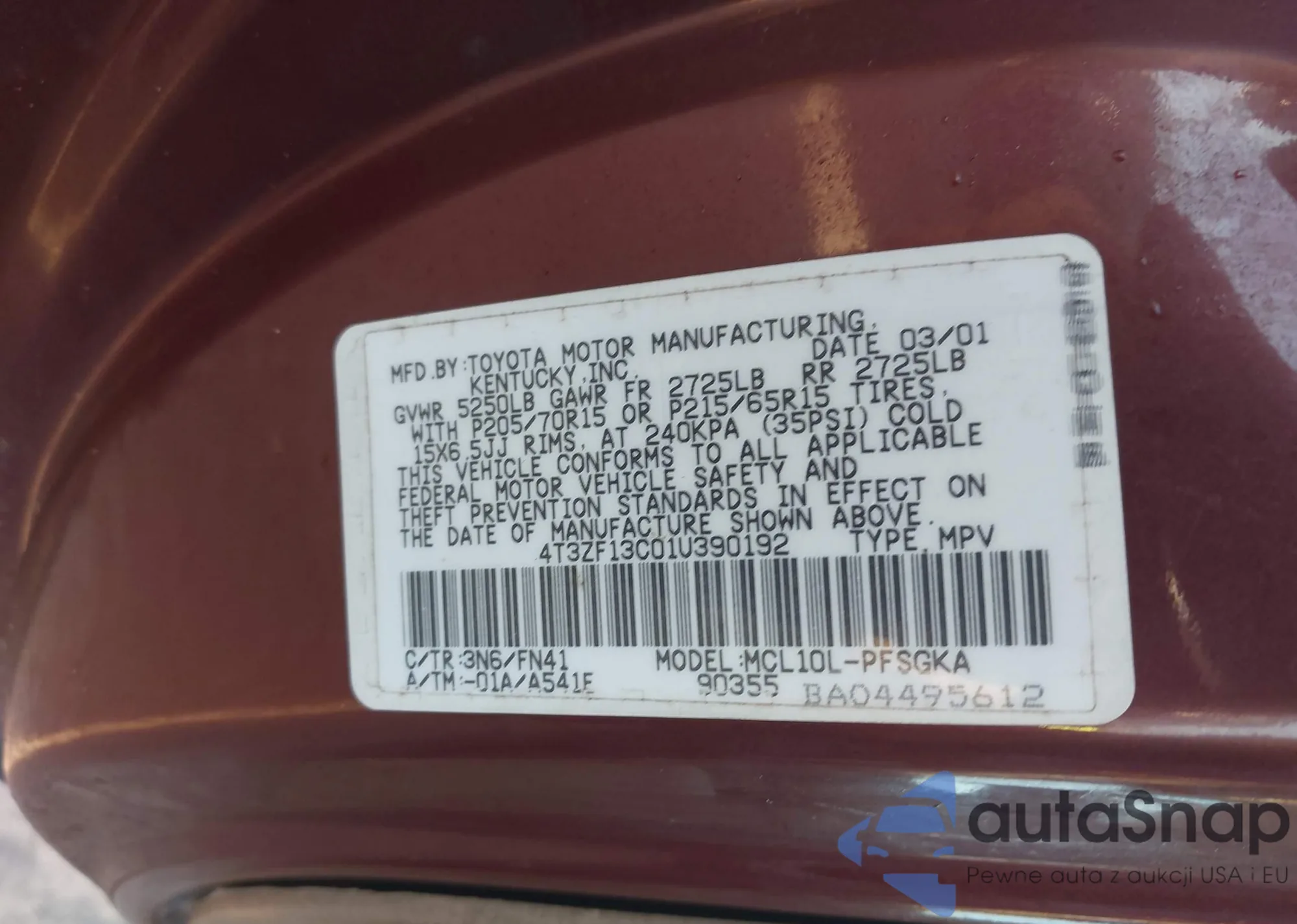 VIN: 4T3ZF13C01U390192
