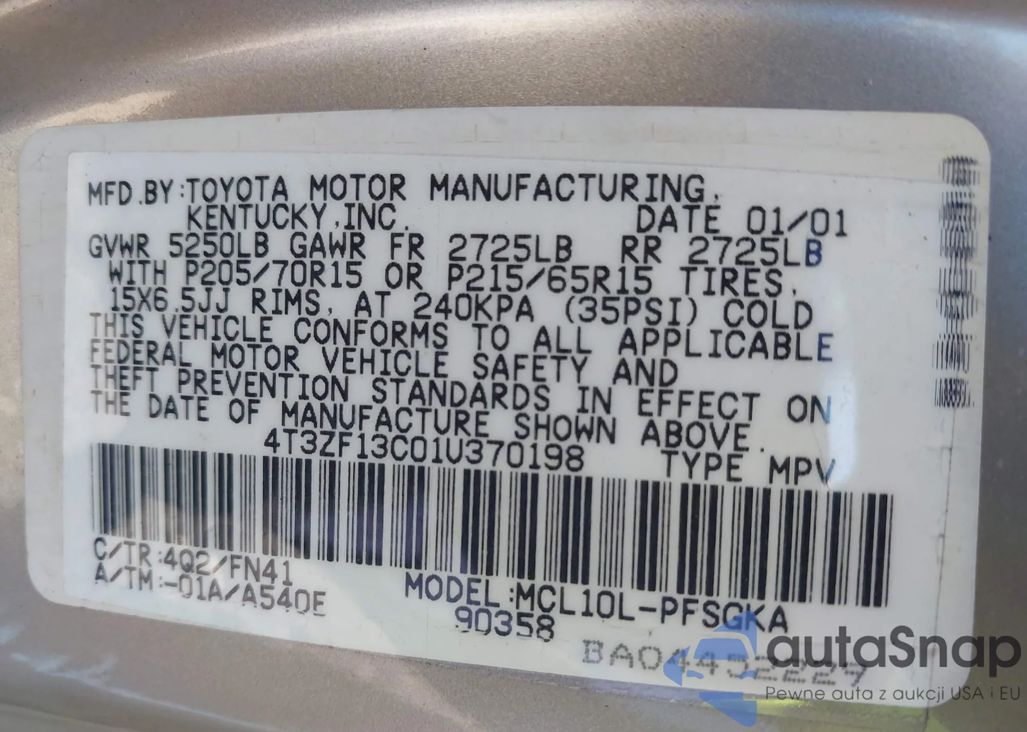 VIN: 4T3ZF13C01U370198