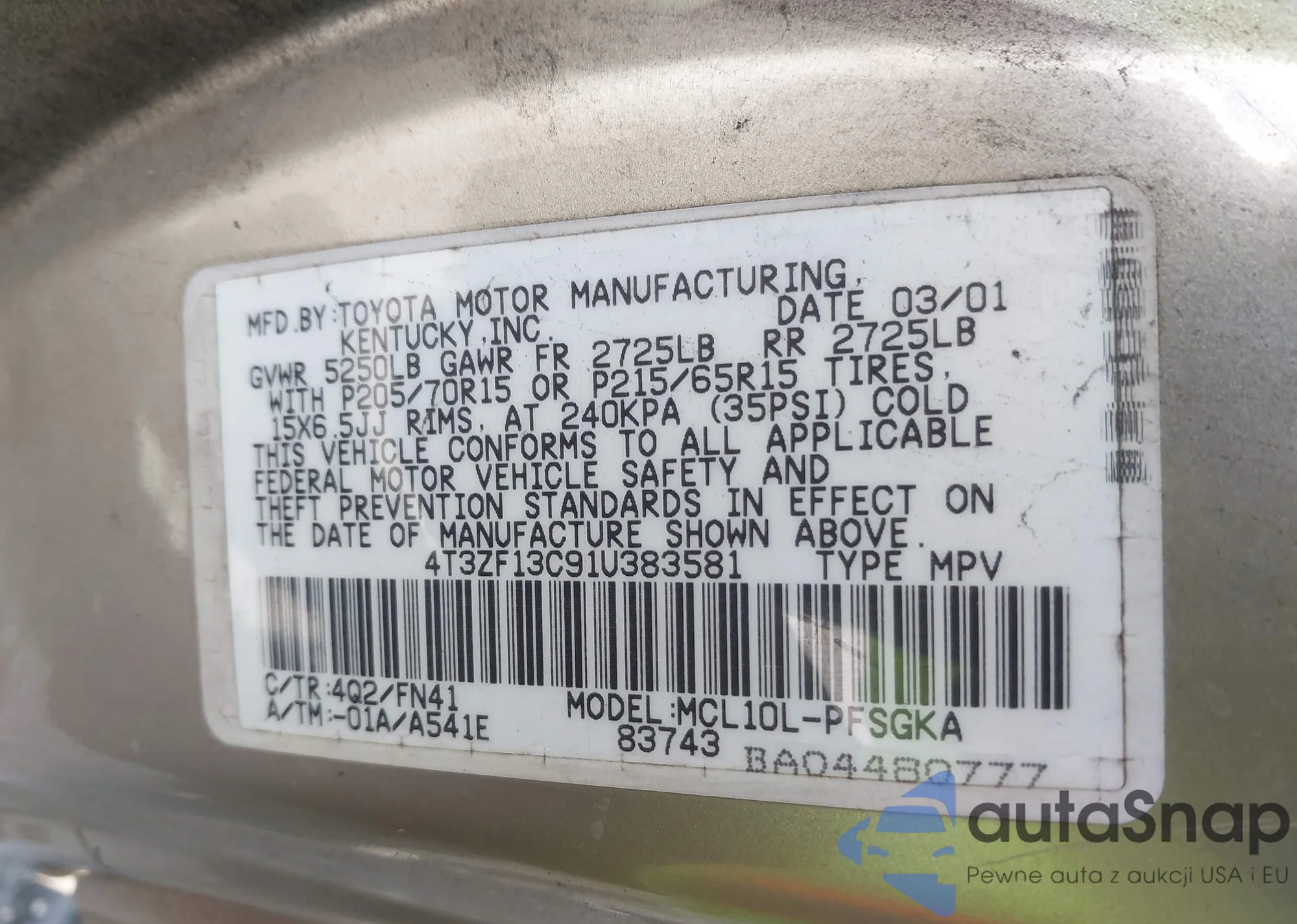 VIN: 4T3ZF13C91U383581