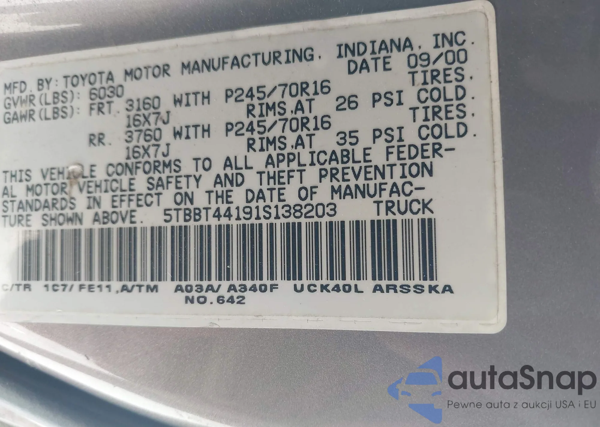 The car Toyota Tundra 2001 (VIN 5TBBT44191S138203) has documents that prevent registration. Export and registration may be difficult. Contact AutaSnap experts to find alternatives.