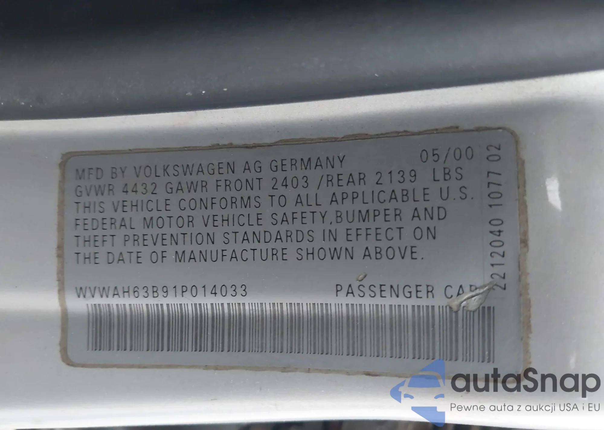 VIN: WVWAH63B91P014033
