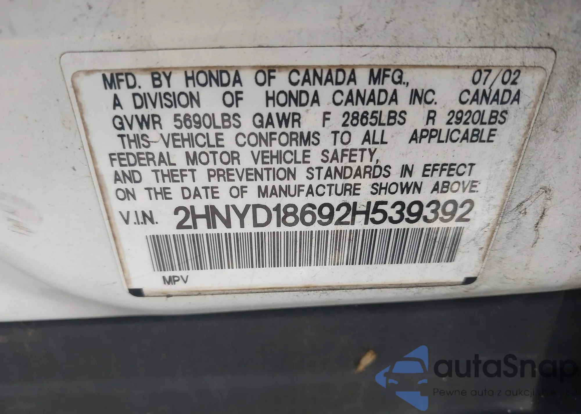 VIN: 2HNYD18692H539392
