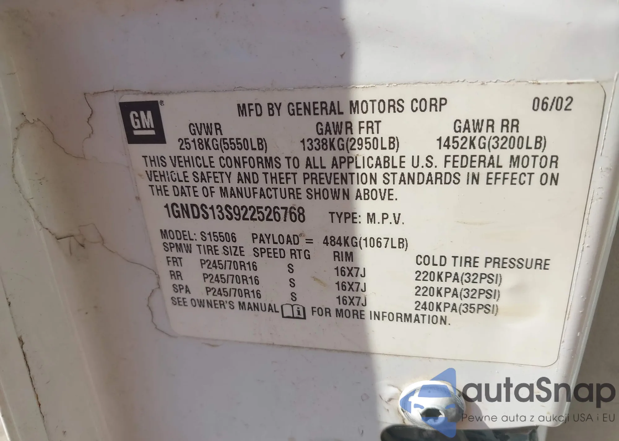 • VIN: 1GNDS13S922526768