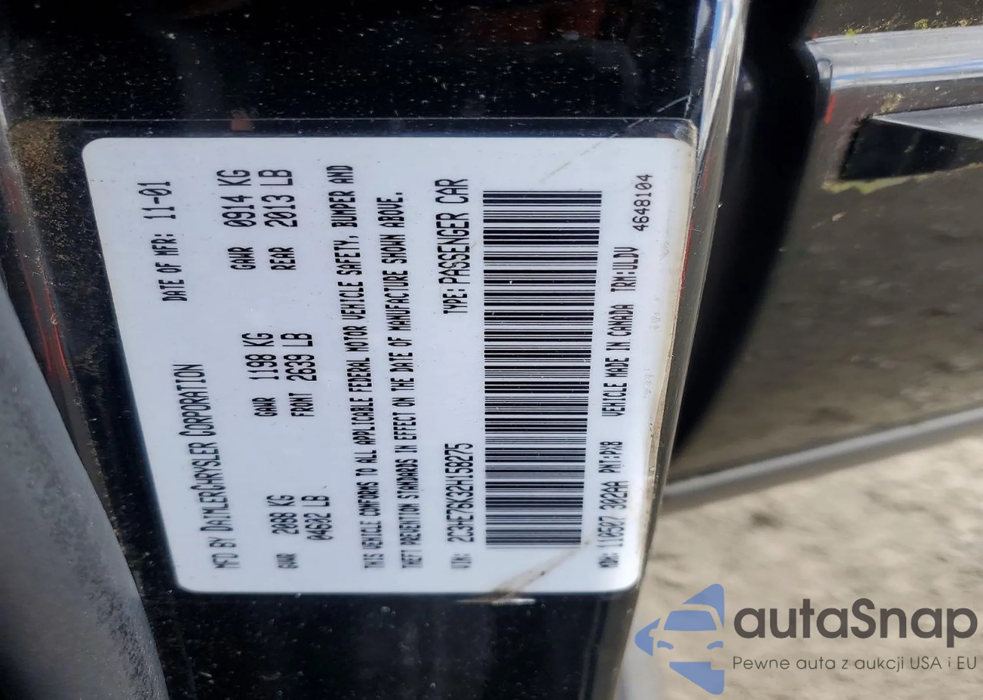 The car Chrysler 300M 2002 (VIN 2C3HE76K32H158275) has documents that prevent registration. Export and registration may be difficult. Contact AutaSnap experts to find alternatives.