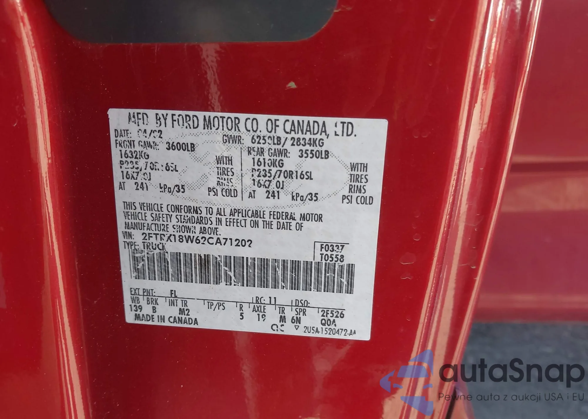 • VIN: 2FTRX18W62CA71202