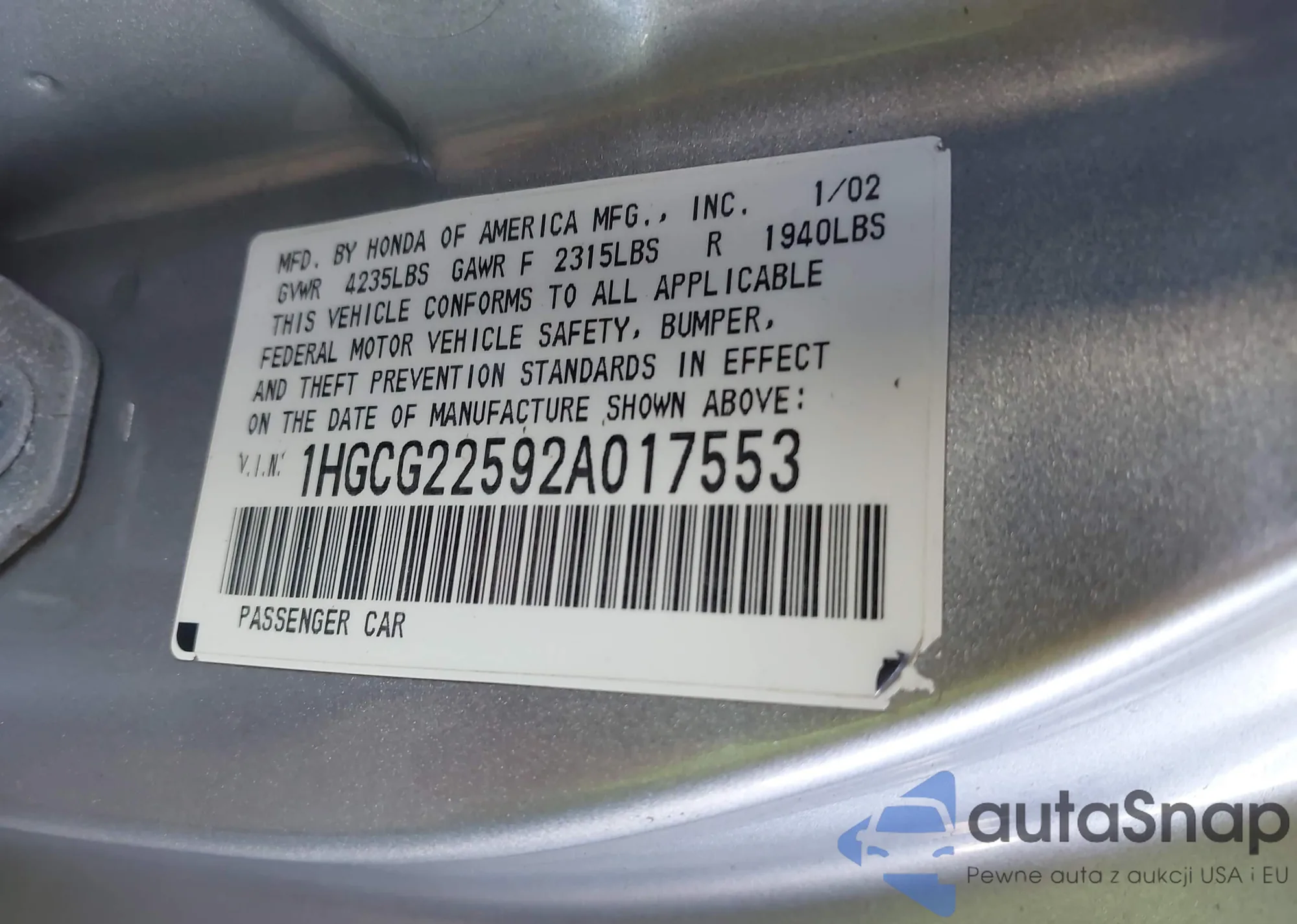 VIN: 1HGCG22592A017553