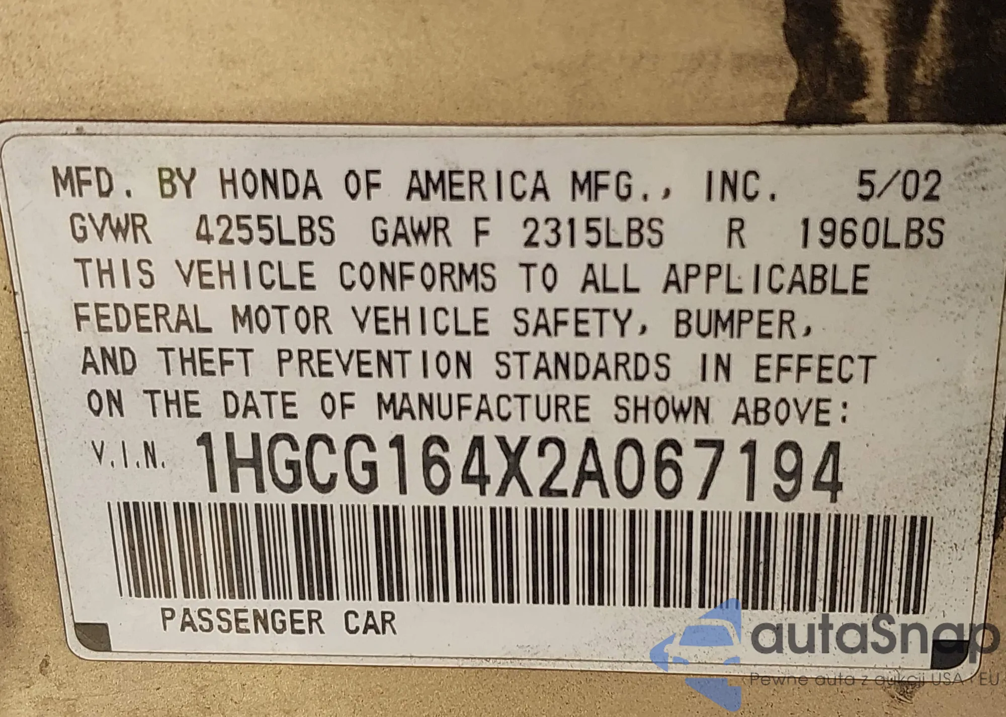 VIN: 1HGCG164X2A067194