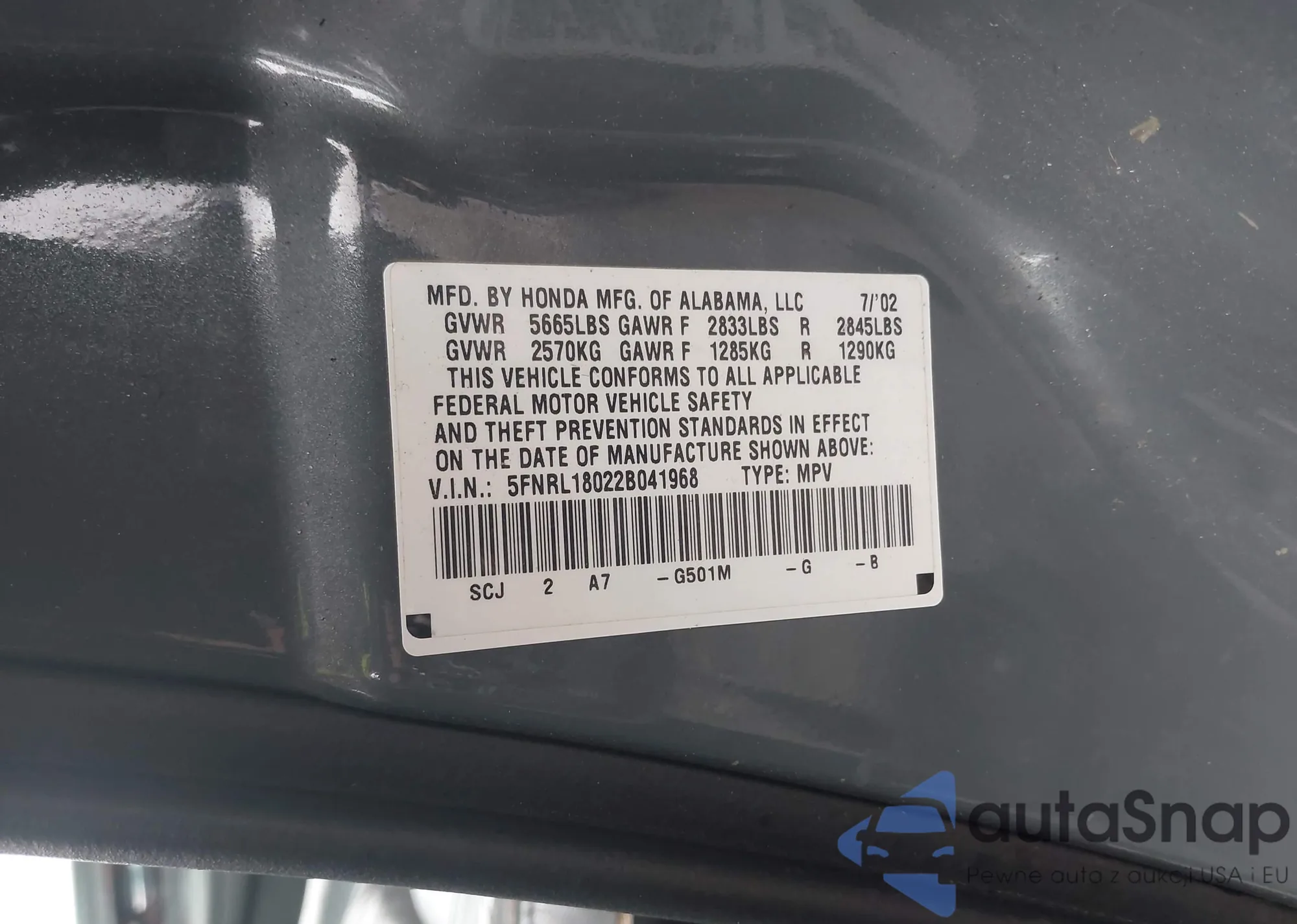 The car Honda Odyssey 2002 (VIN 5FNRL18022B041968) has documents that prevent registration. Export and registration may be difficult. Contact AutaSnap experts to find alternatives.