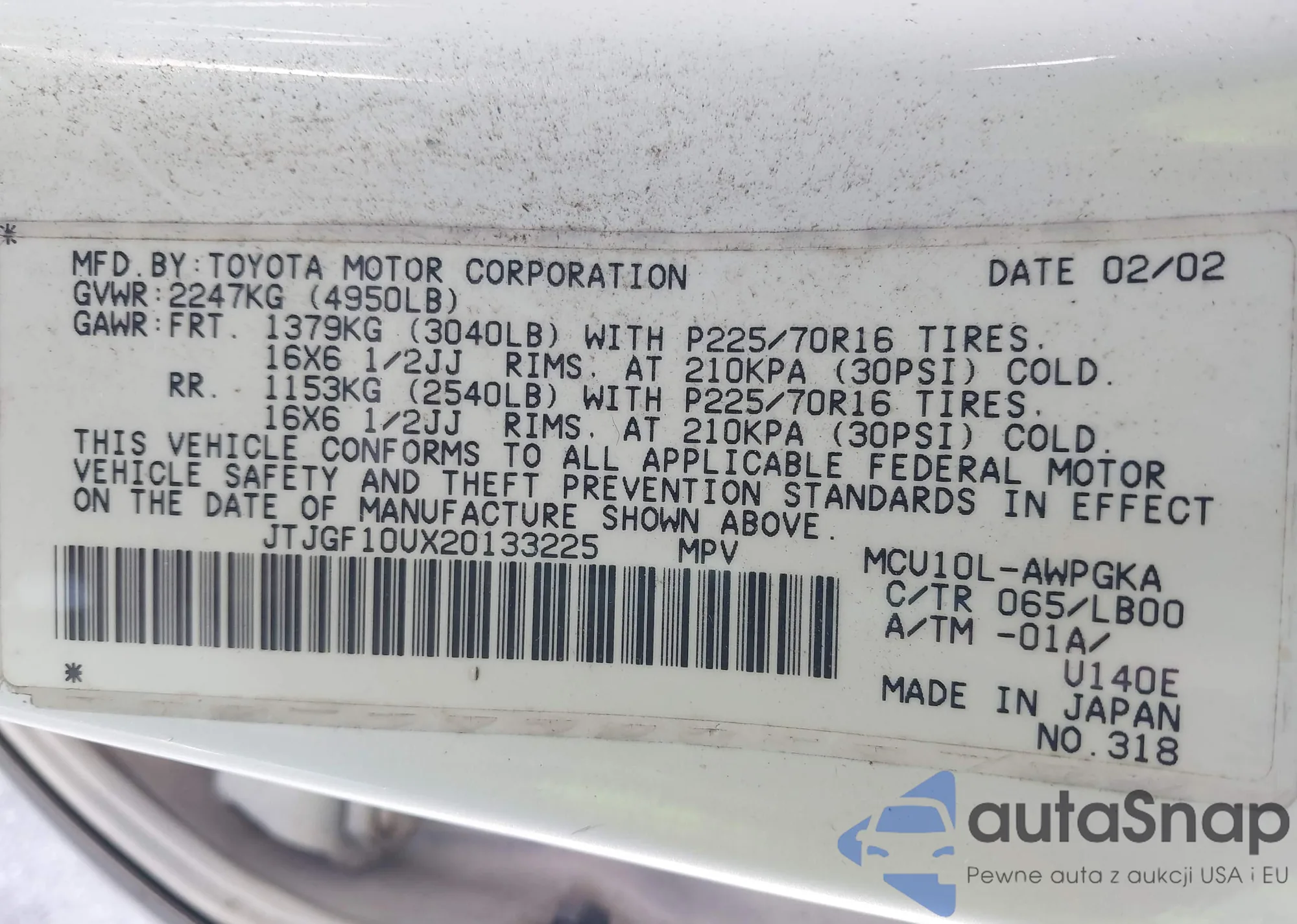 The car Lexus RX 2002 (VIN JTJGF10UX20133225) has not been auctioned before. The documents are clean, and the mileage matches or is below the market average. Sold by an insurance company – we recommend purchase. Delivery to the port will take approx. 6–8 weeks.