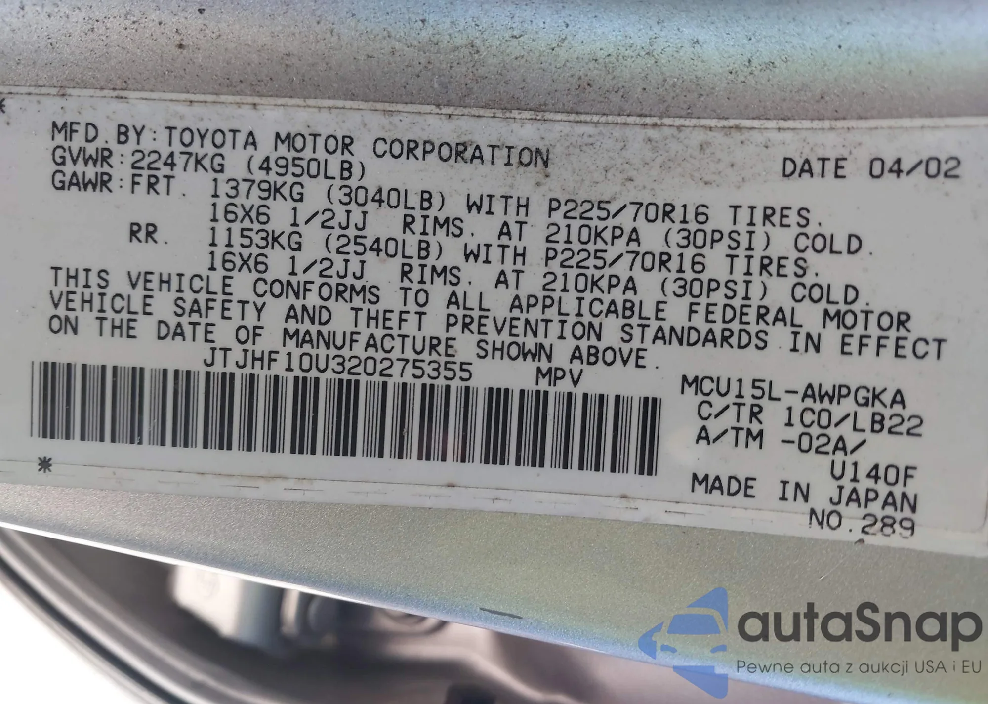 The car Lexus RX 2002 (VIN JTJHF10U320275355) has not been auctioned before. The documents are clean, and the mileage matches or is below the market average. Sold by an insurance company – we recommend purchase. Delivery to the port will take approx. 6–8 weeks.
