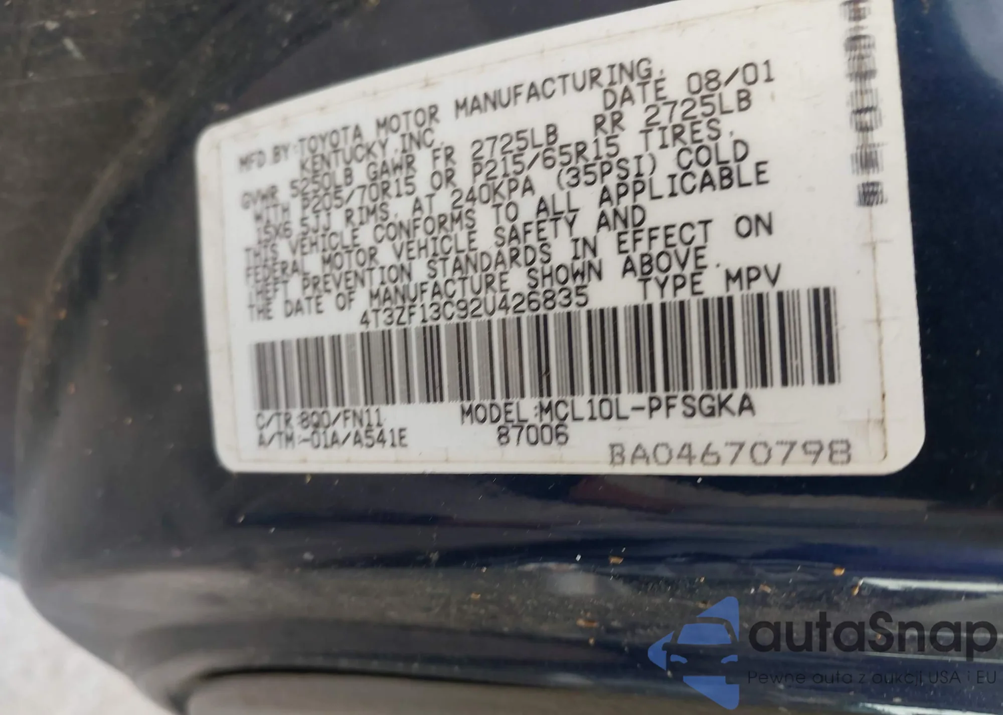 VIN: 4T3ZF13C92U426835