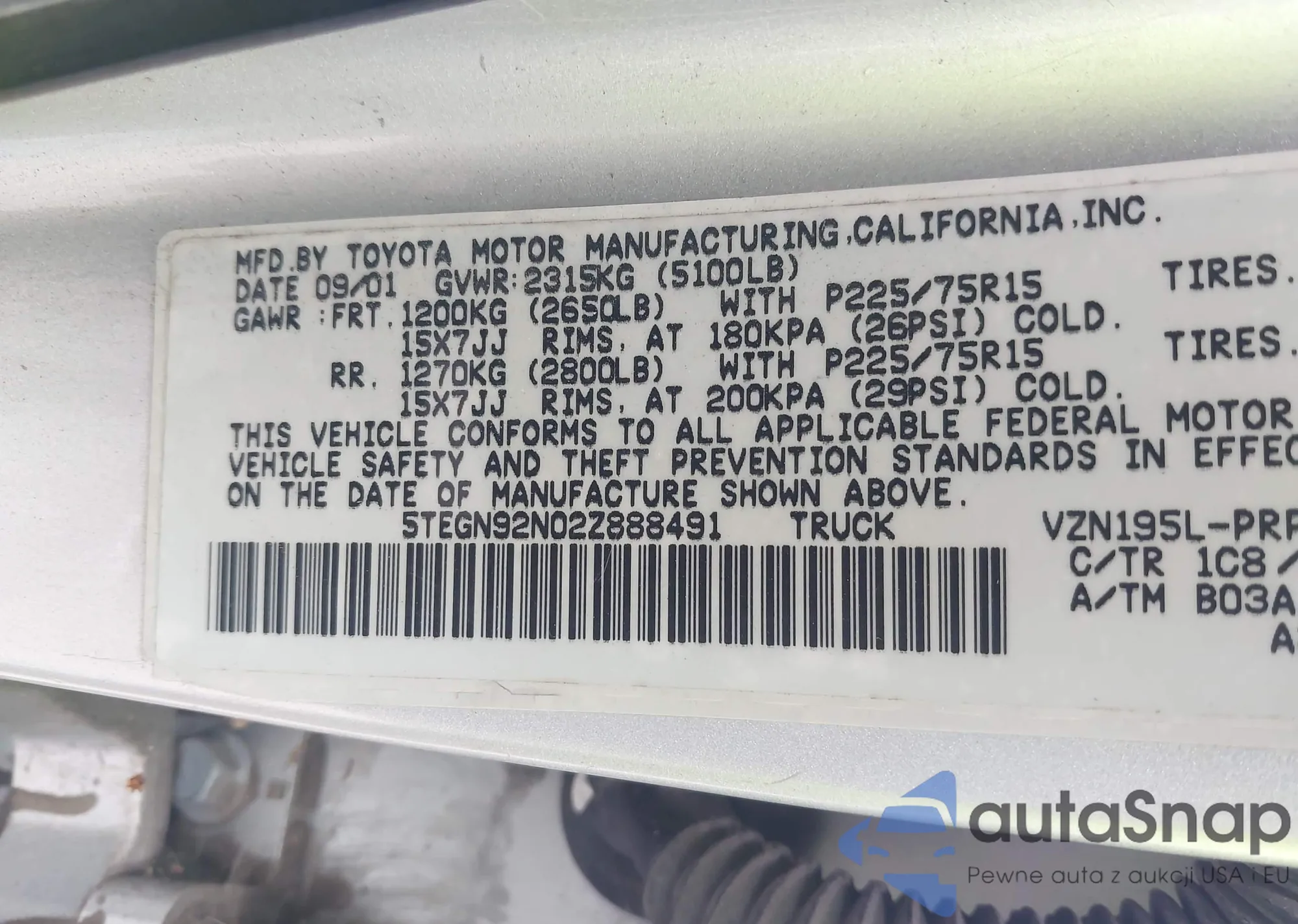 The car Toyota Tacoma 2002 (VIN 5TEGN92N02Z888491) has not been auctioned before. The documents are clean, and the mileage matches or is below the market average. Sold by an insurance company – we recommend purchase. Delivery to the port will take approx. 6–8 weeks.