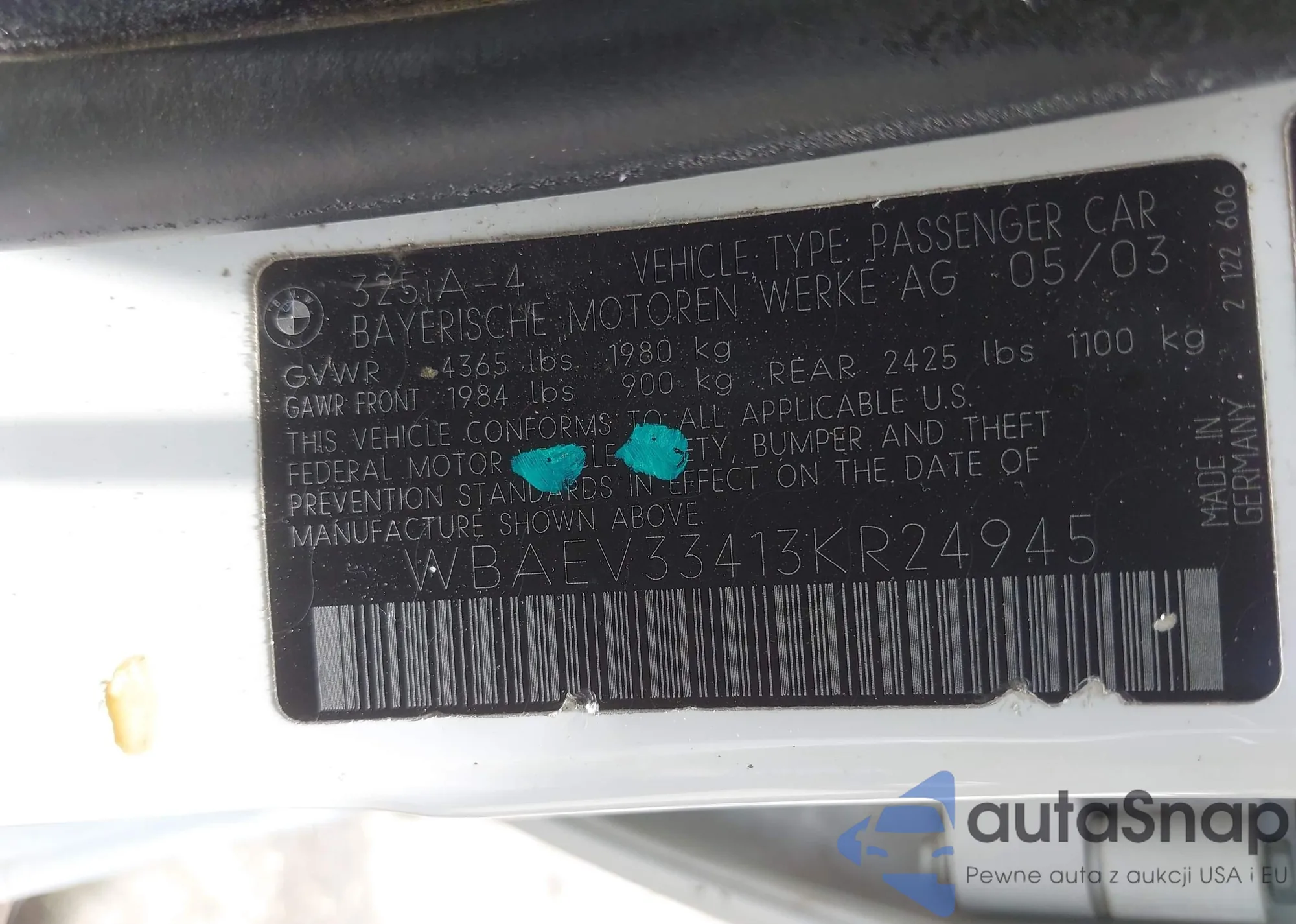 VIN: WBAEV33413KR24945