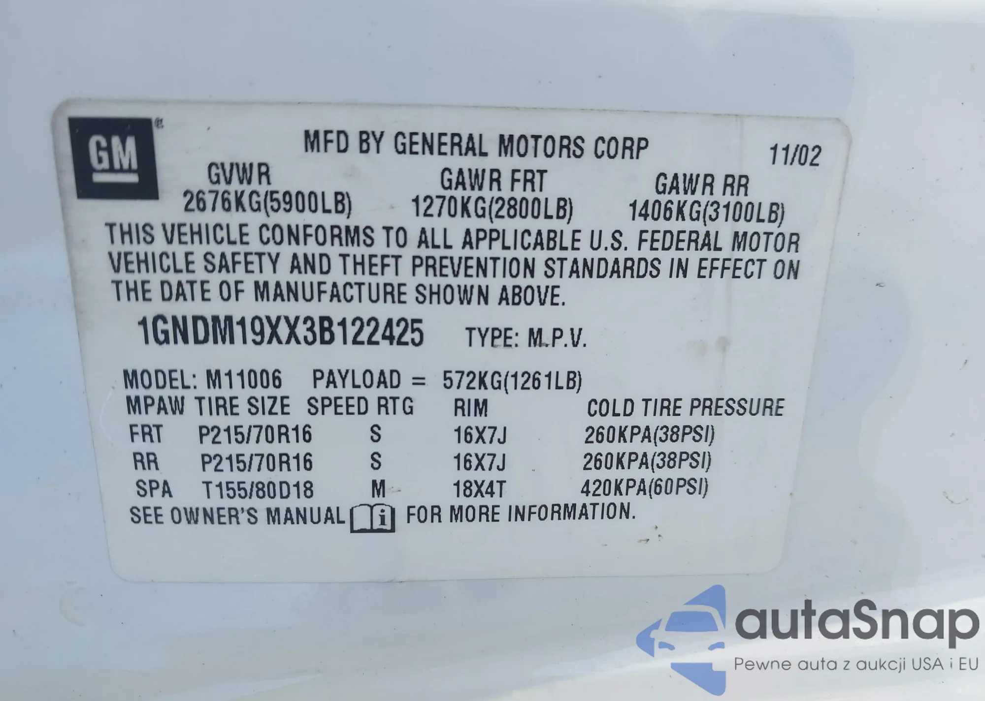 • VIN: 1GNDM19XX3B122425