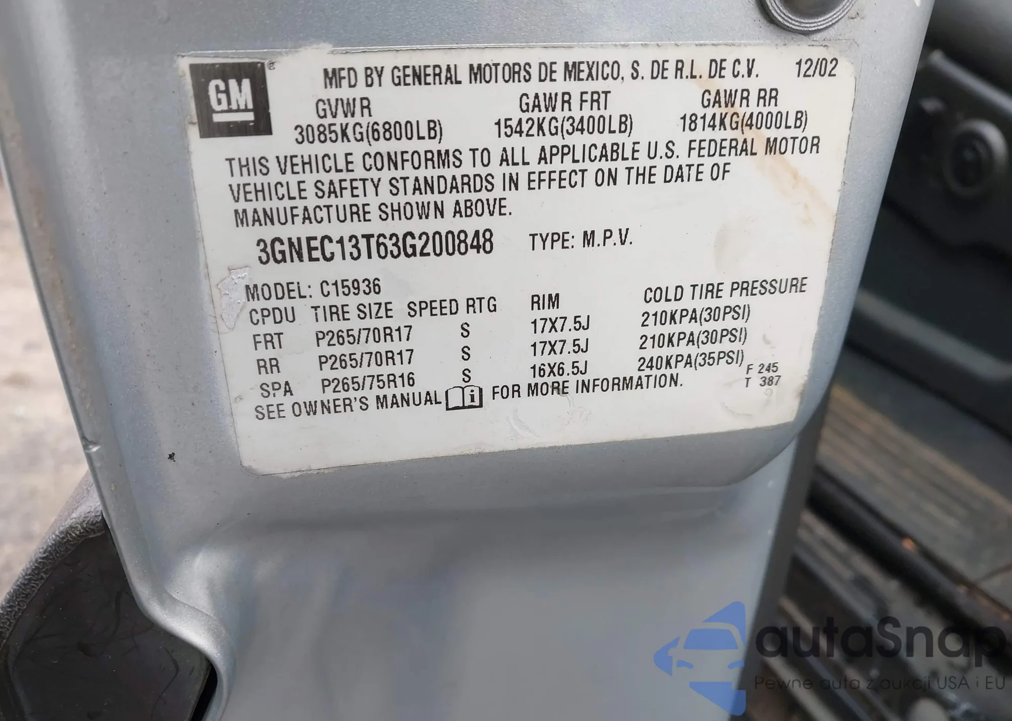 • VIN: 3GNEC13T63G200848