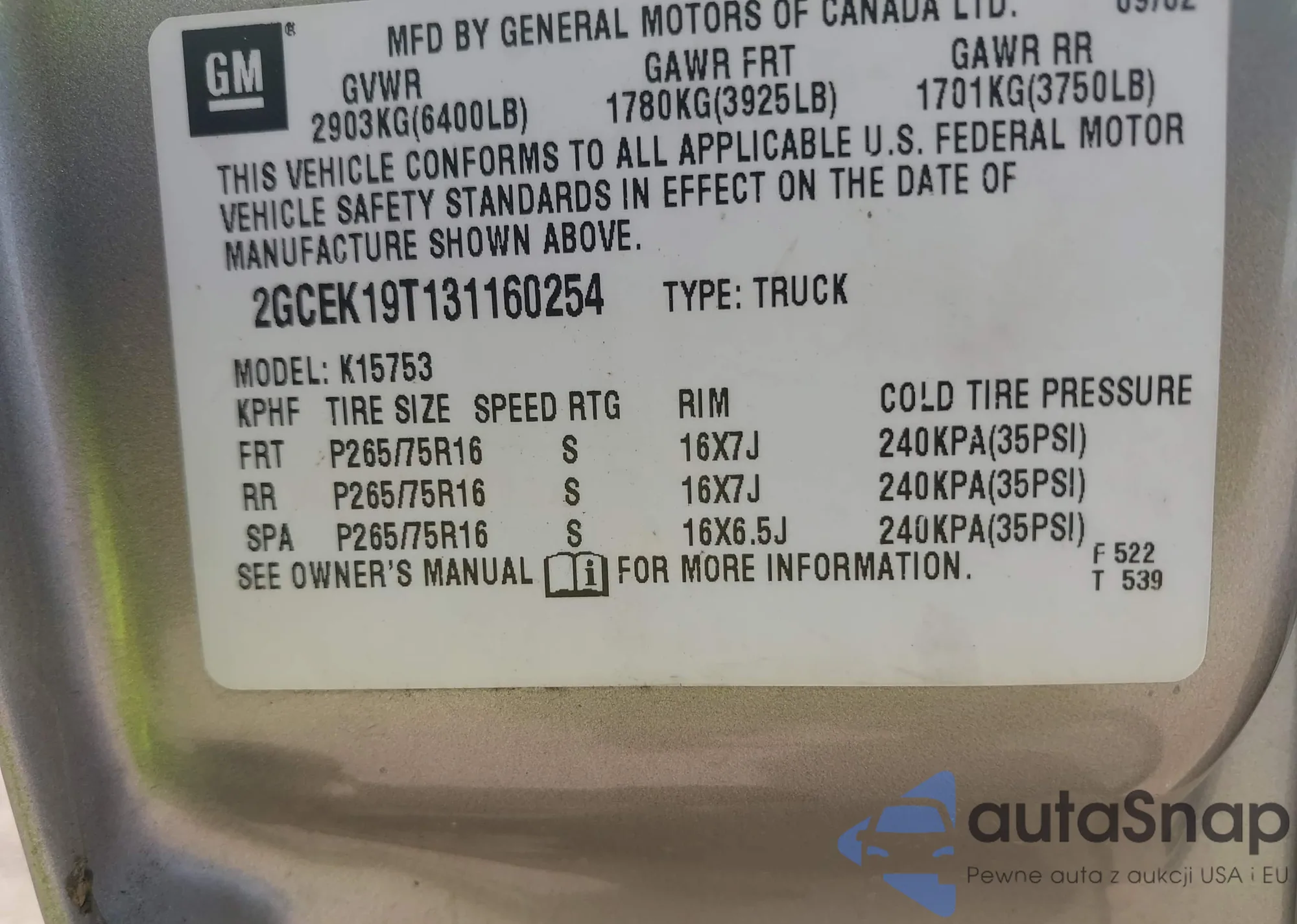 VIN: 2GCEK19T131160254