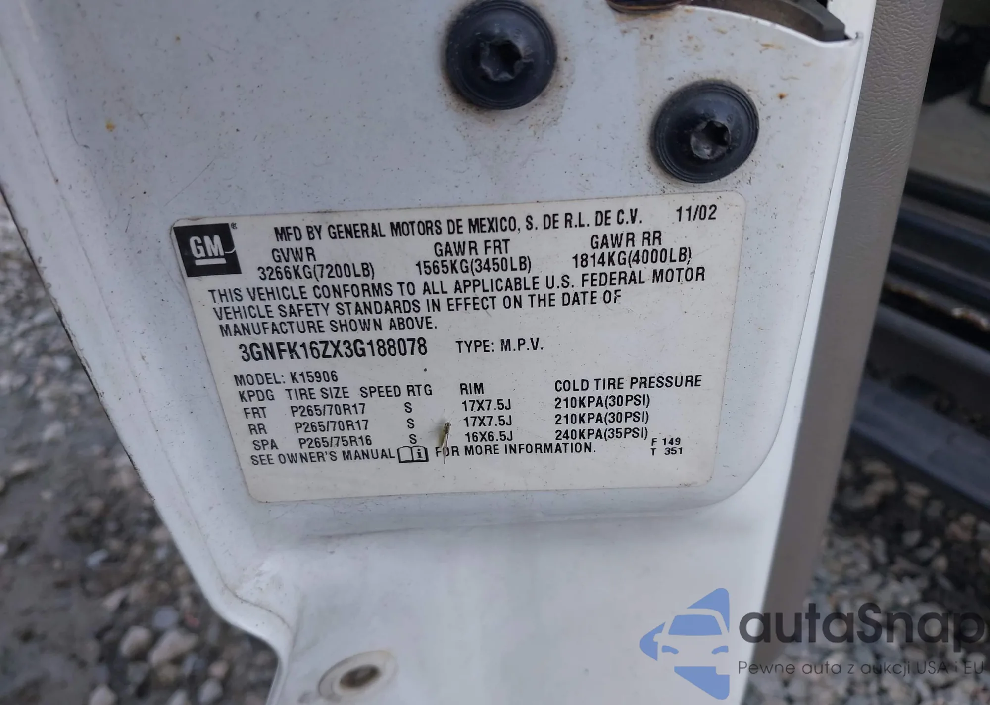 • VIN: 3GNFK16ZX3G188078