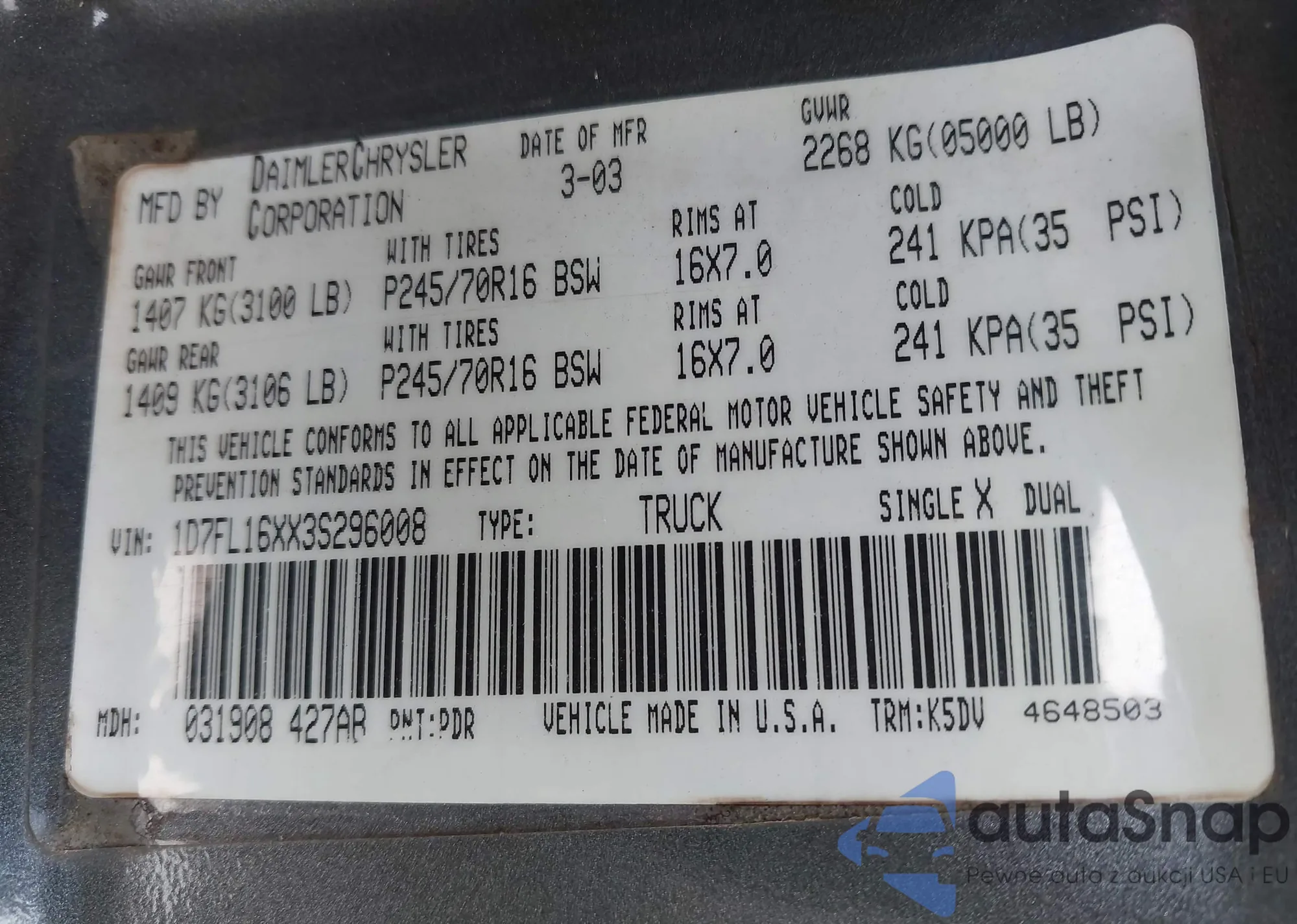 VIN: 1D7FL16XX3S296008