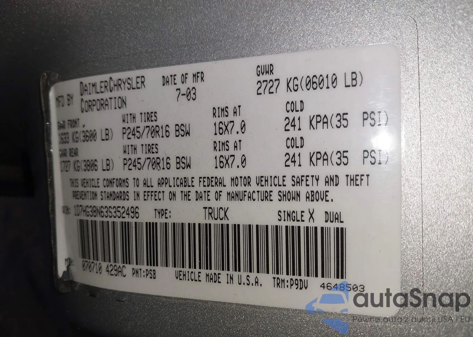 The car Dodge Dakota 2003 (VIN 1D7HG38N63S352496) has not been auctioned before. The documents are clean, and the mileage matches or is below the market average. Sold by an insurance company – we recommend purchase. Delivery to the port will take approx. 6–8 weeks.