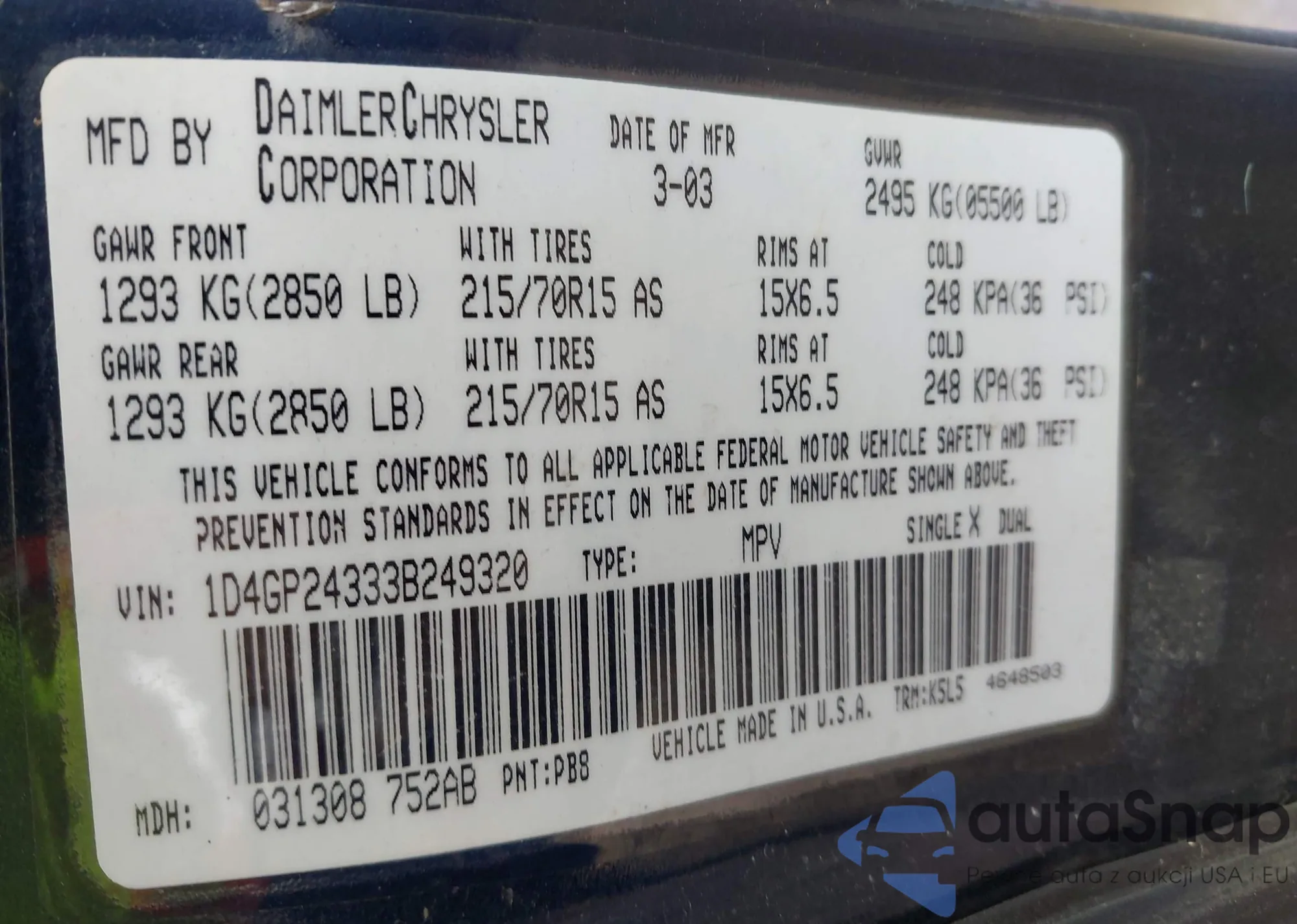 The car Dodge Caravan 2003 (VIN 1D4GP24333B249320) is sold by an unverified seller. We recommend checking the Carfax report and confirming registration possibilities before purchase.