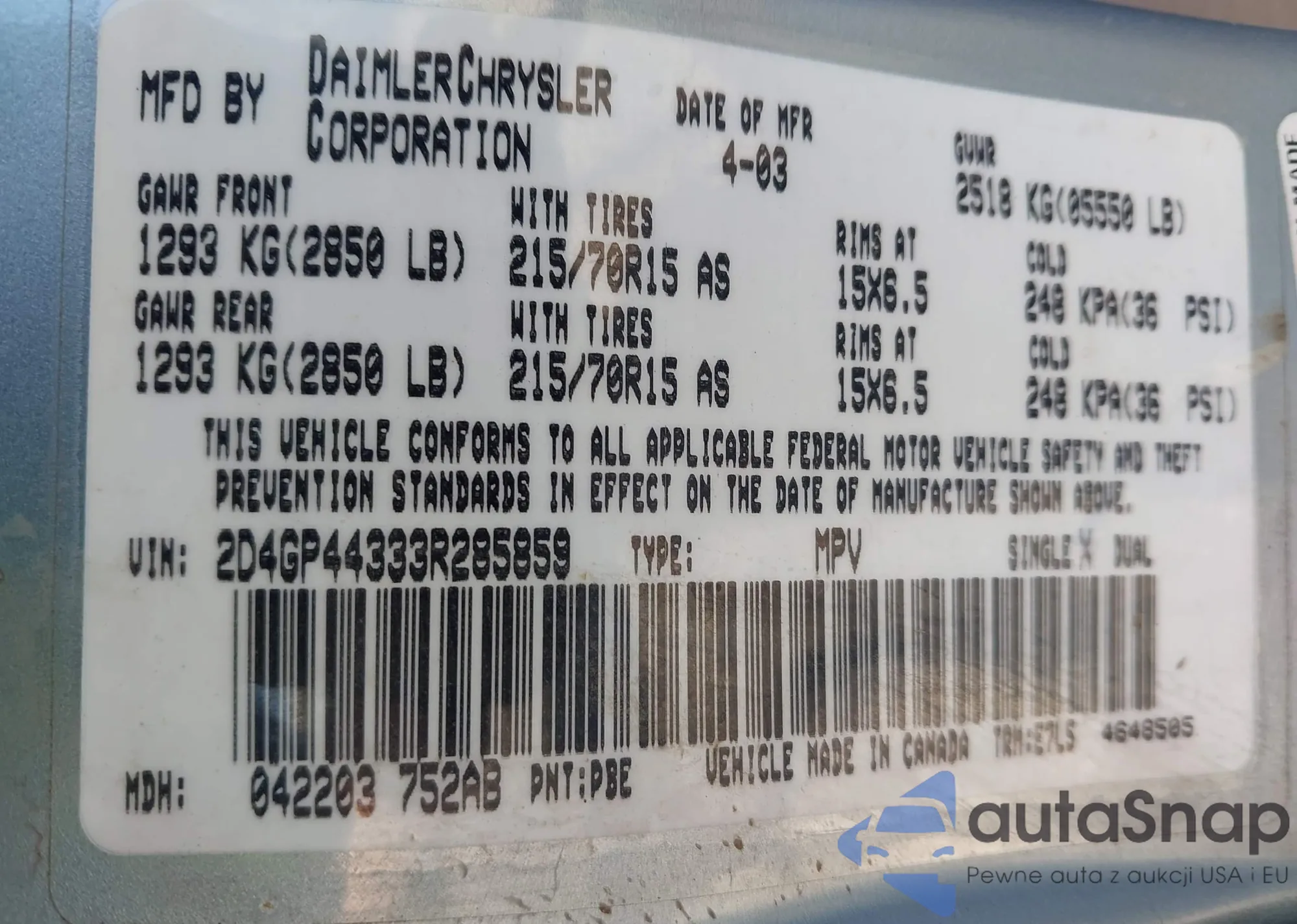 • VIN: 2D4GP44333R285859