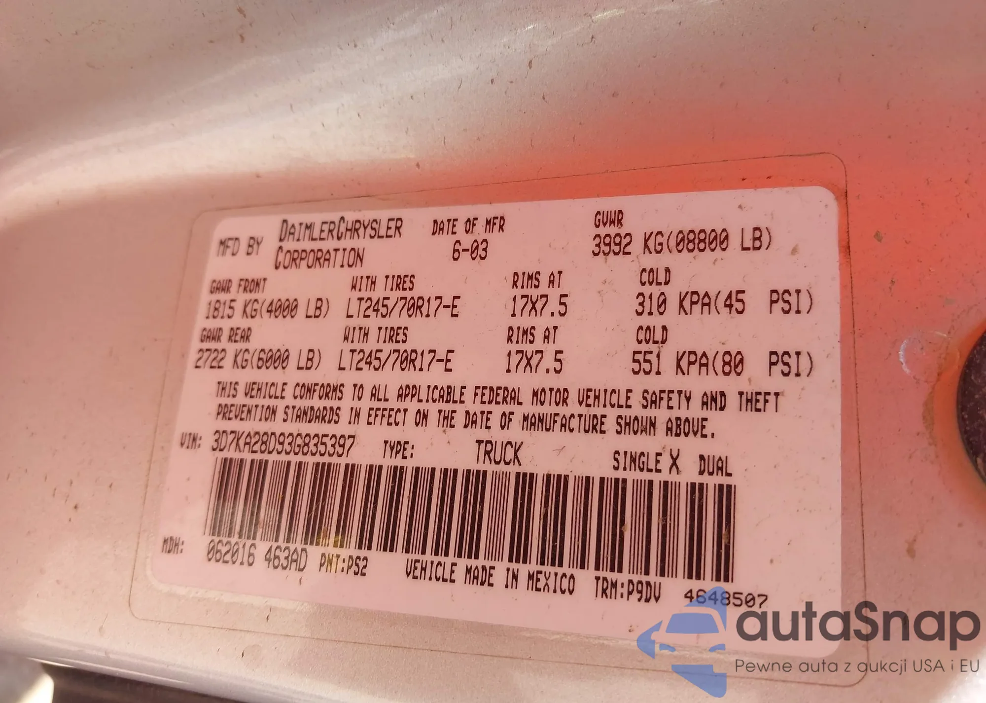 • VIN: 3D7KA28D93G835397
