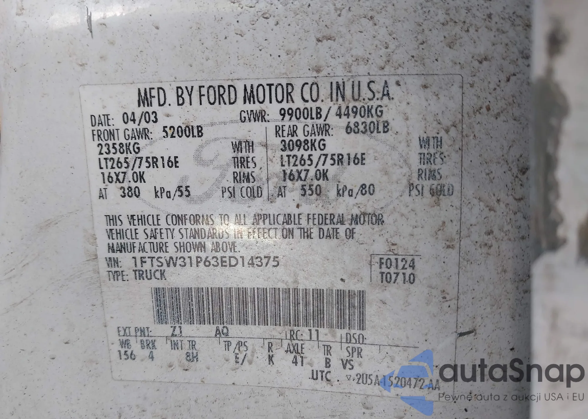 The car Ford F350 2003 (VIN 1FTSW31P63ED14375) has not been auctioned before. The documents are clean, and the mileage matches or is below the market average. Sold by an insurance company – we recommend purchase. Delivery to the port will take approx. 6–8 weeks.