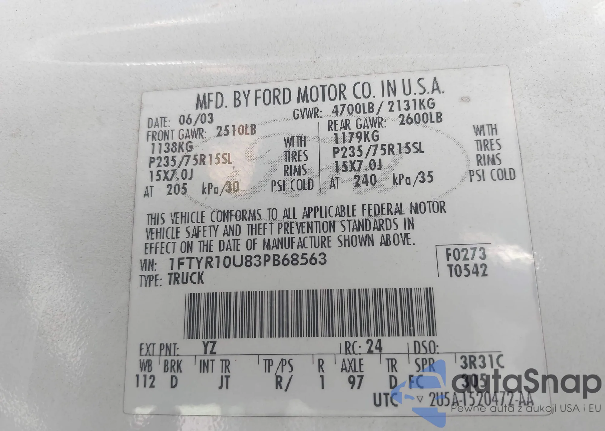 VIN: 1FTYR10U83PB68563