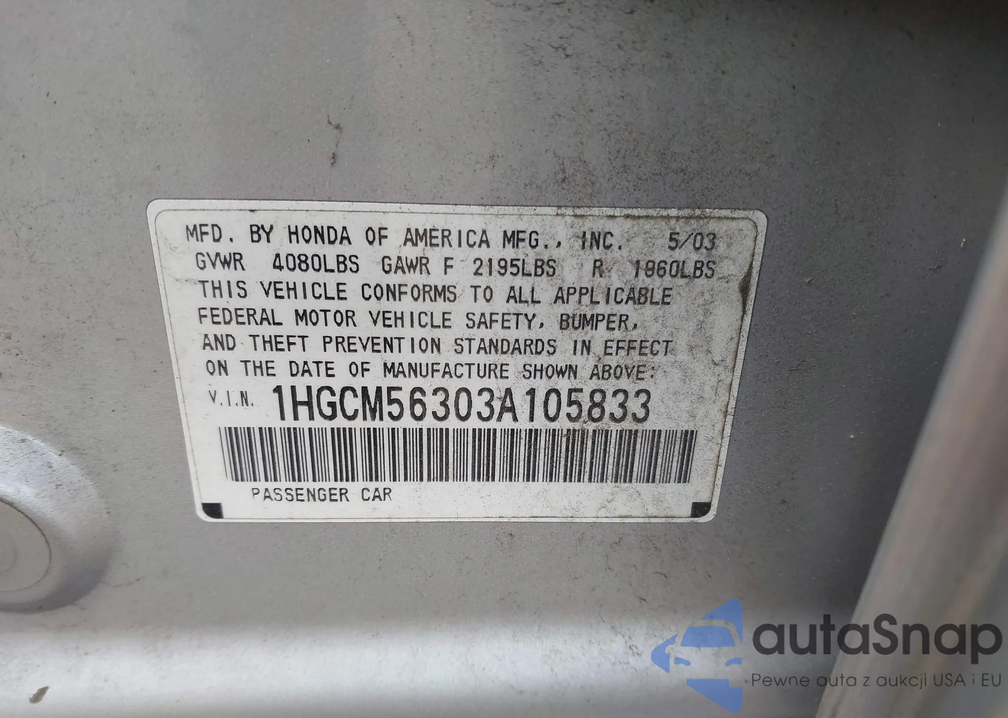 VIN: 1HGCM56303A105833