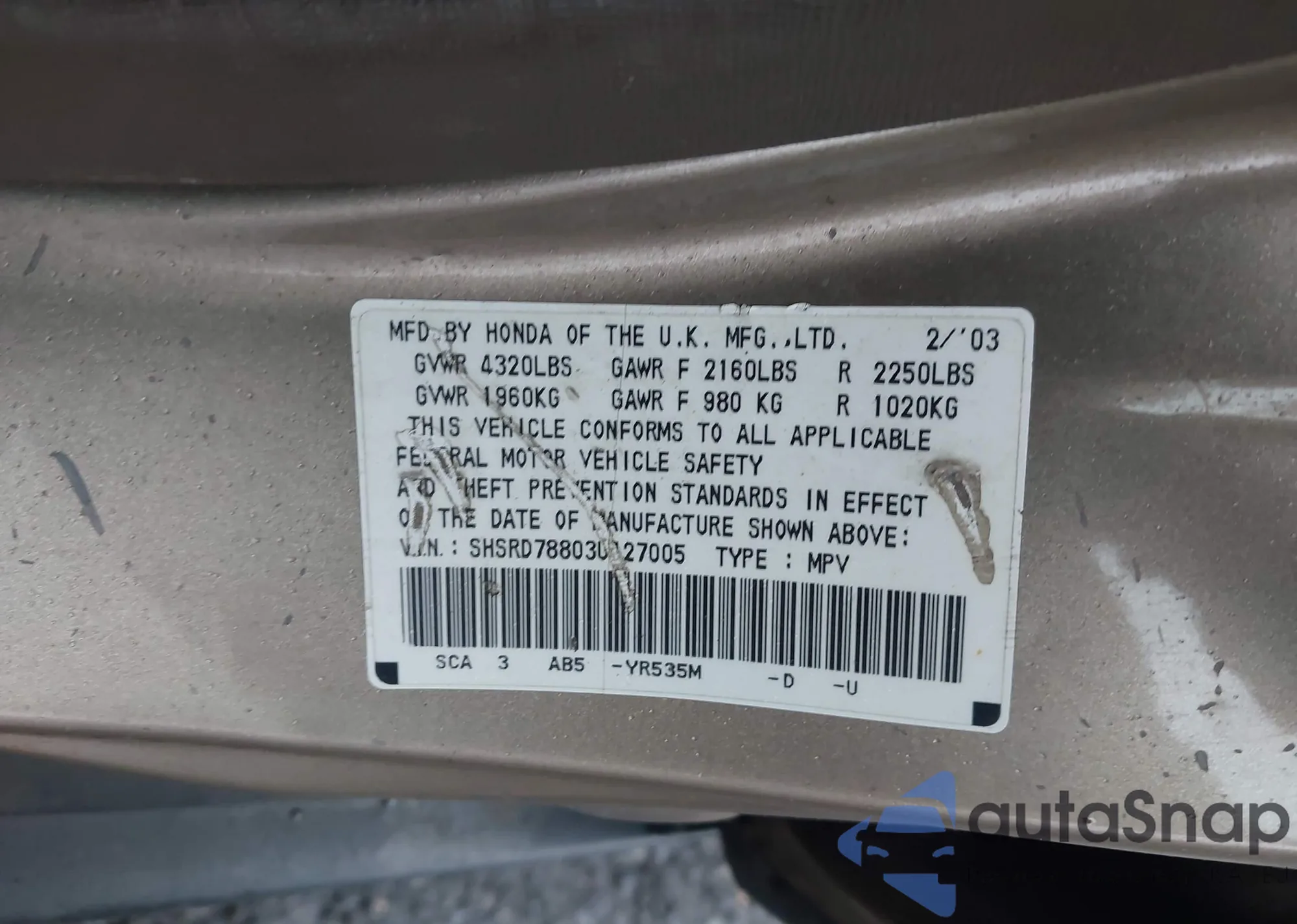 VIN: SHSRD78803U127005