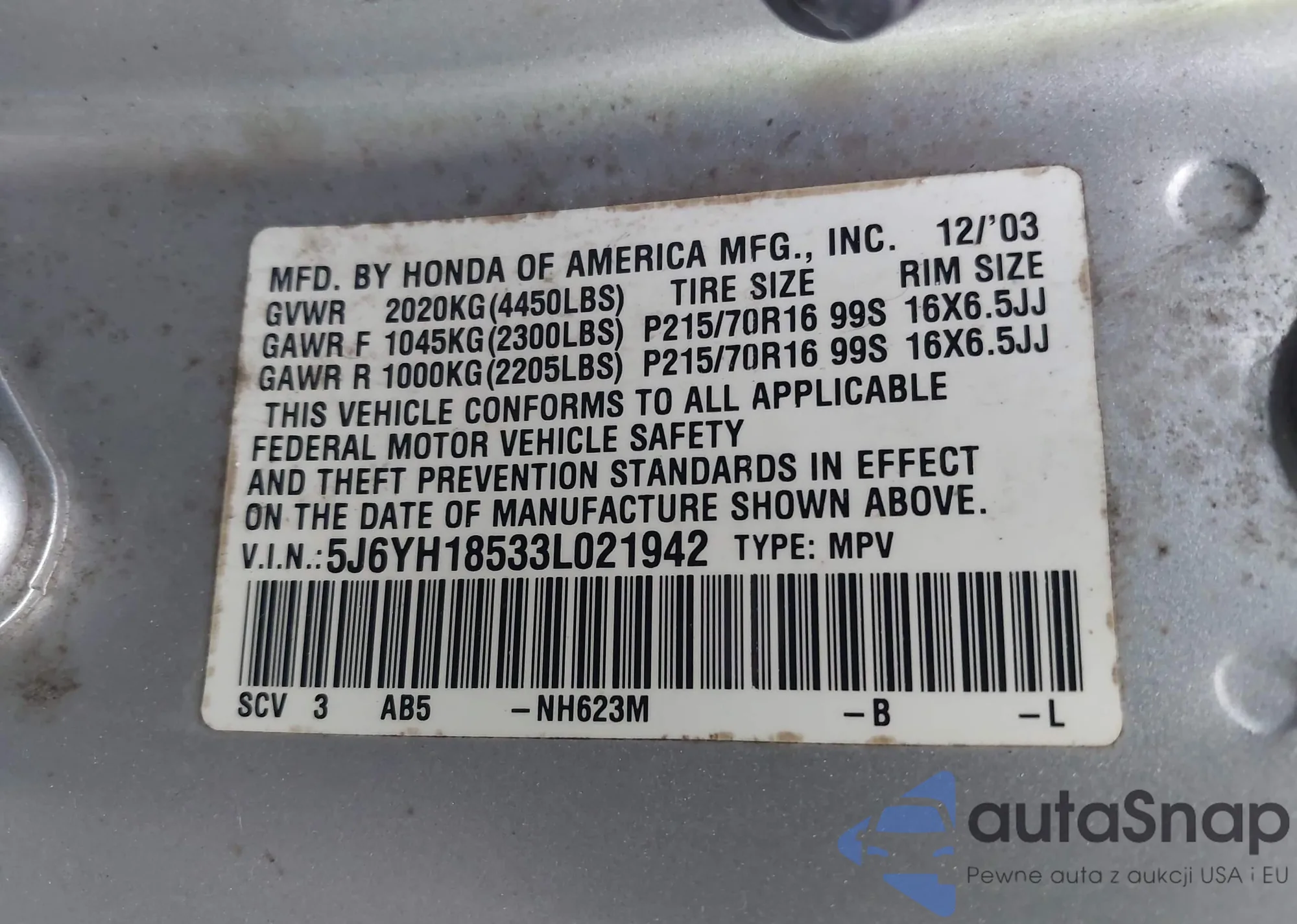 VIN: 5J6YH18533L021942
