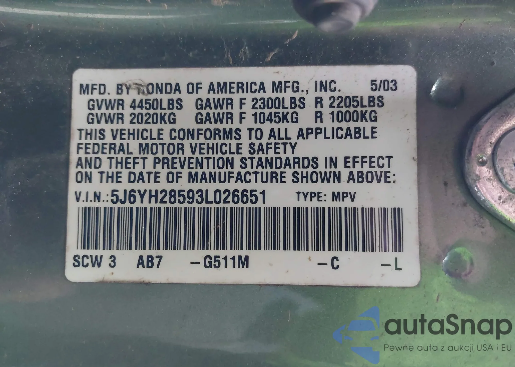 VIN: 5J6YH28593L026651