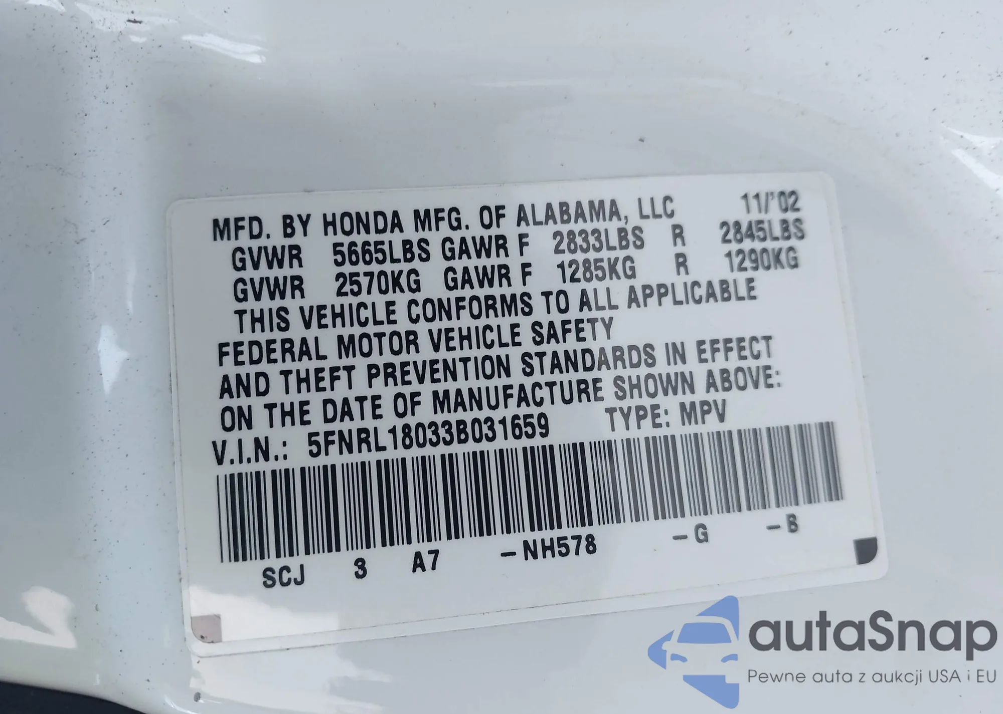VIN: 5FNRL18033B031659